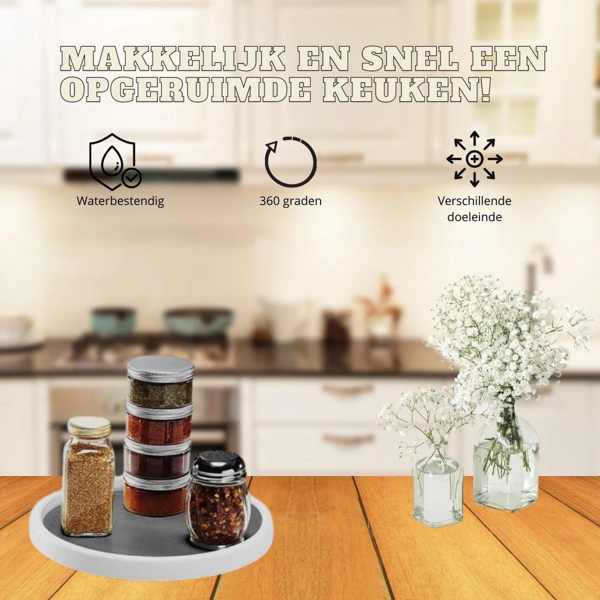 De draaiplateau heeft een fijne maat, zodat die eigenlijk wel in ieder keukenkastje past. Je kunt er dus van alles op kwijt, omdat deze plateau wel 360 graden kan draaien! Zo kom je dus ook bij de producten die helemaal achteraan.