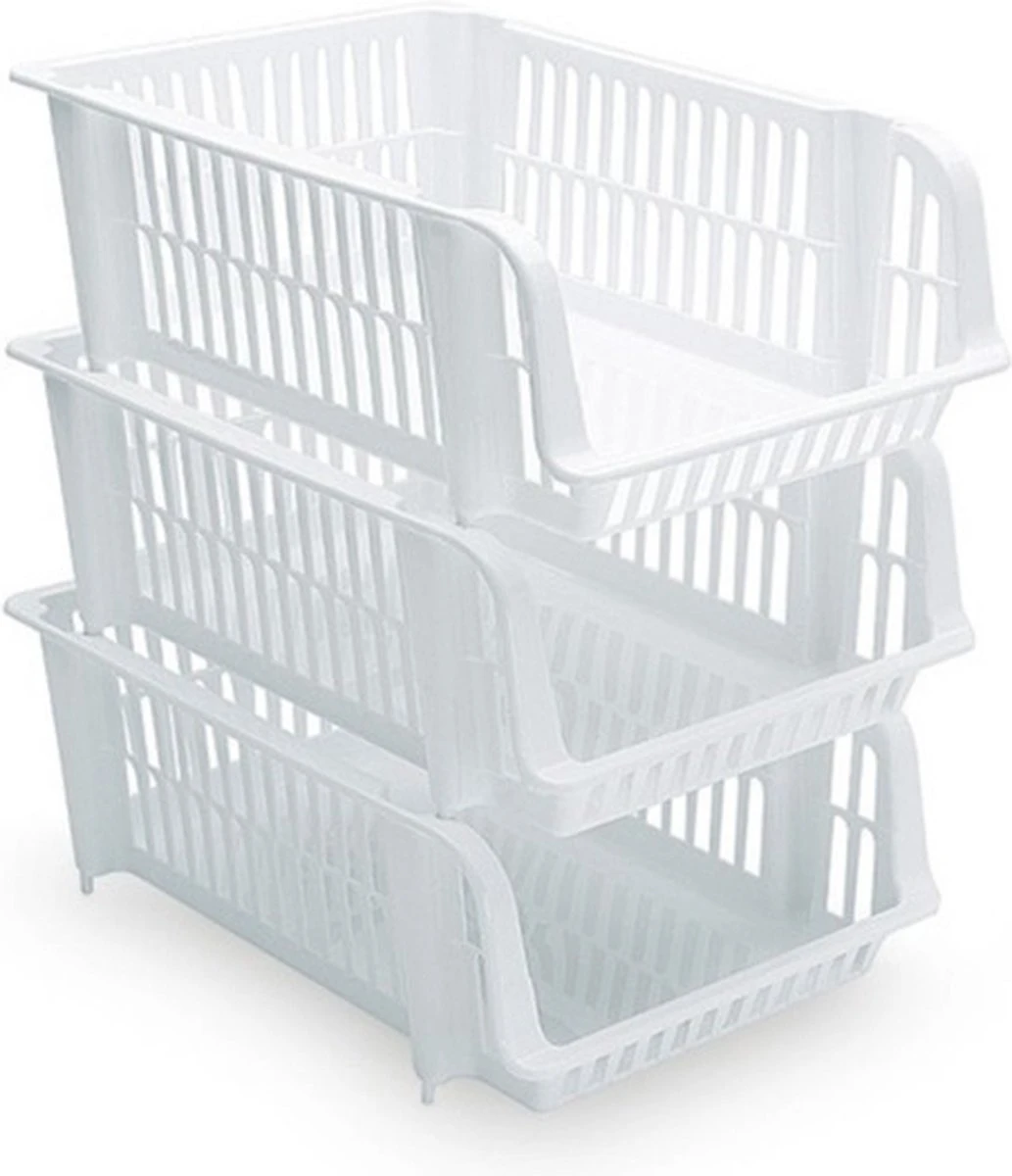 3x Witte opbergmanden/opbergdozen/opbergboxen stapelbaar 20 liter kunststof. Deze opbergmanden zijn zo ontworpen dat ze op elkaar gestapeld kunnen worden, om zoveel opbergruimte te creëren als u nodig heeft. De manden hebben een simpel en stevig ontwerp en zijn geschikt voor het opbergen van allerlei spullen, zoals speelgoed, schoenen en tijdschriften. Ook ideaal voor in de badkamer of in de voorraadkast. Formaat: ongeveer 43 x 32 x 16,5 cm. Materiaal: kunststof.