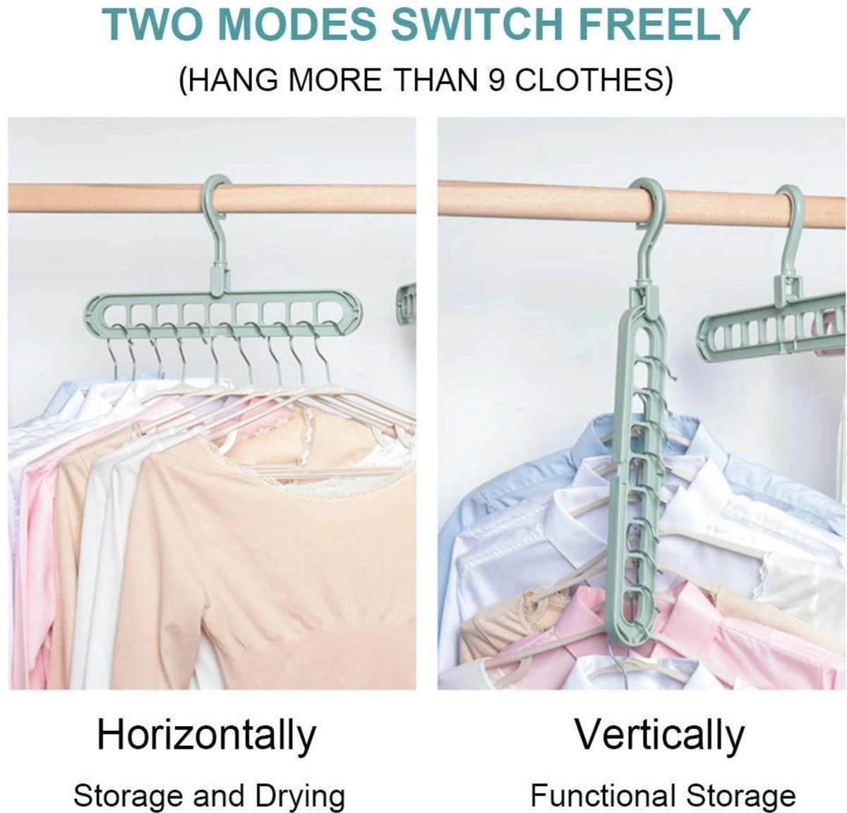 Een grote hanger met daarin 9 grote hangers. In plaats van 1 kledingstuk, kun jij nu 9 kledingstukken tegelijk op hangen. En omdat de hanger 360 graden kan draaien kun je ook kledingstukken die in het midden of achteraan hangen eenvoudig pakken.