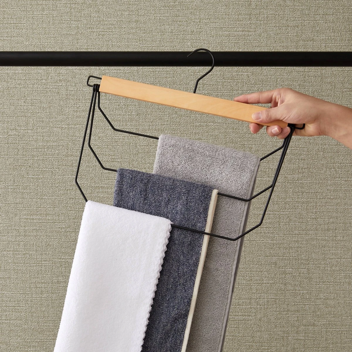 Met het slimme 3-in-1-ontwerp dat het meeste uit de verticale ruimte haalt, kan één hanger 3 broeken organiseren en weinig ruimte innemen. Door hun smalle design zijn ze een echte game-changer voor wie weinig kastruimte heeft! De hangers kunnen natuurlijk ook gebruikt worden voor andere doeleinden, zoals het ophangen van handdoeken en andere kledingstukken.