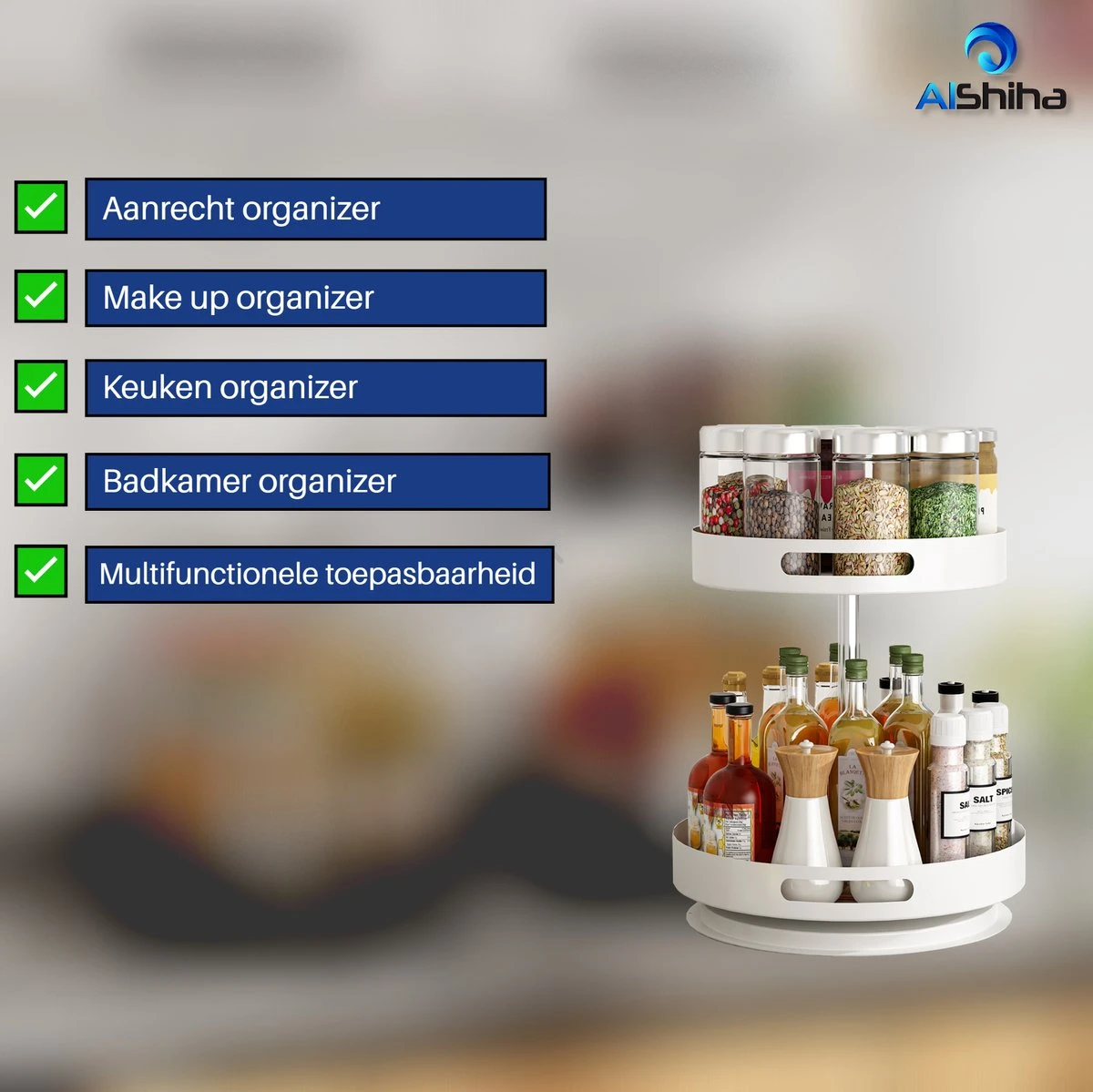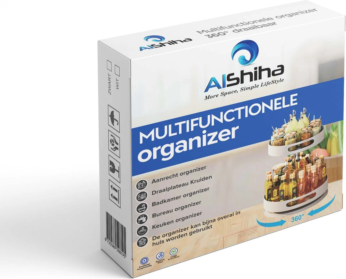 De AlShiha organizer helpt je keuken er netter en opgeruimd uit te zien. Als kruidenrek maakt het van je aanrecht – met al z’n potjes, molentjes en flessen – een sfeervol en kleurrijk geheel. Kies daarom voor de draaibare AlShiha organizer en tover straks in een handomdraai elk gerecht om tot een feestmaal.