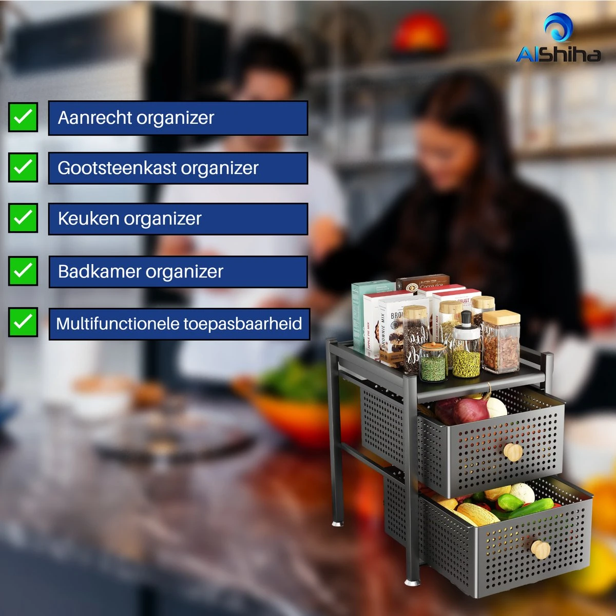 Kookt u het liefst elke dag verse maaltijden, maar komt u nogal eens koelkastruimte tekort om al die zalige ingrediënten uit het zicht te bewaren? Geen zorgen. Met de AlShiha keukenorganizer bewaart u een keur aan groente, fruit en specerijen desgewenst uit het zicht. De organizer past namelijk perfect in uw gootsteenkast. Maar ook in een hoek op uw aanrecht misstaat-ie niet.