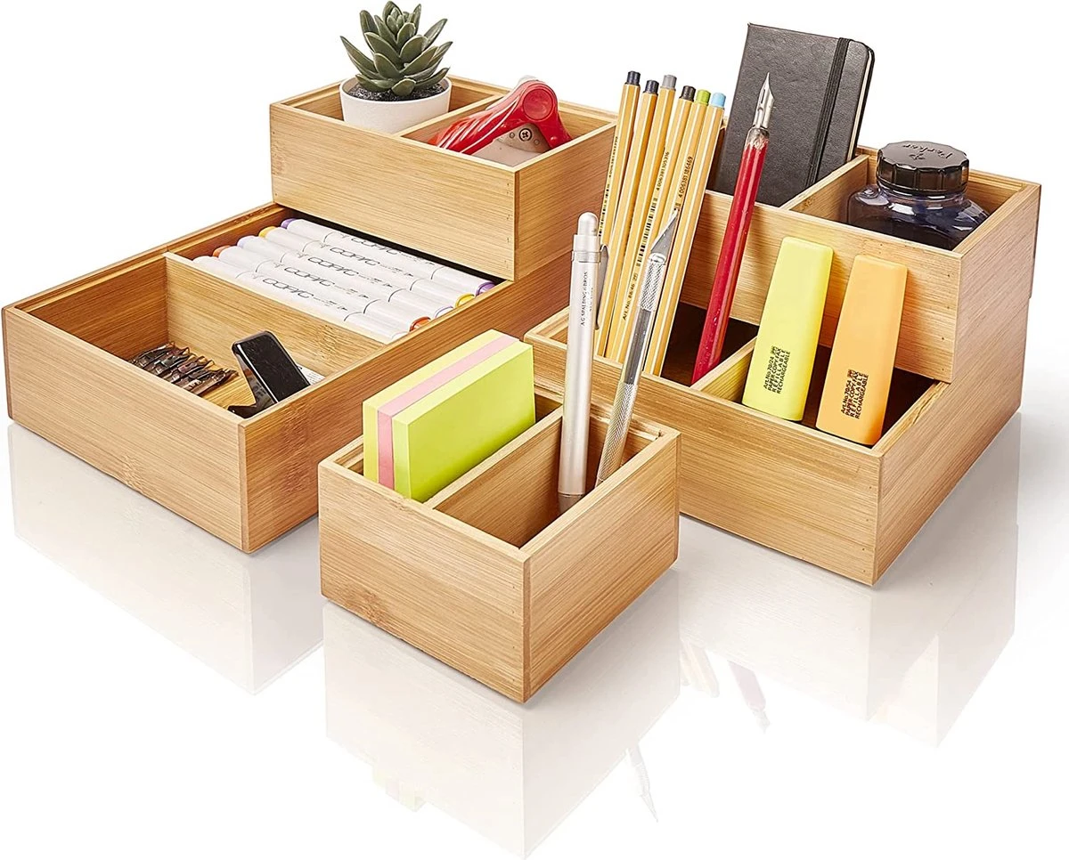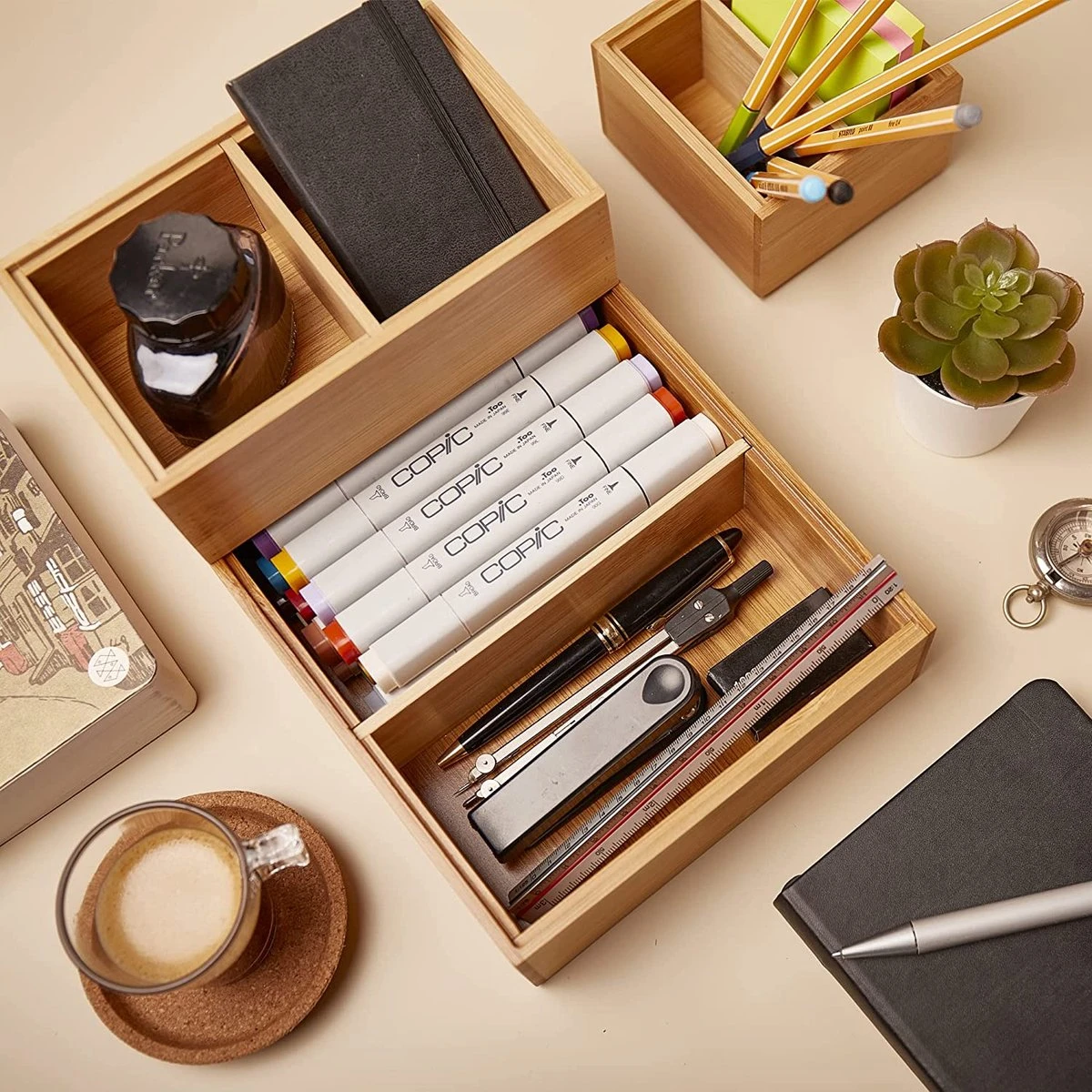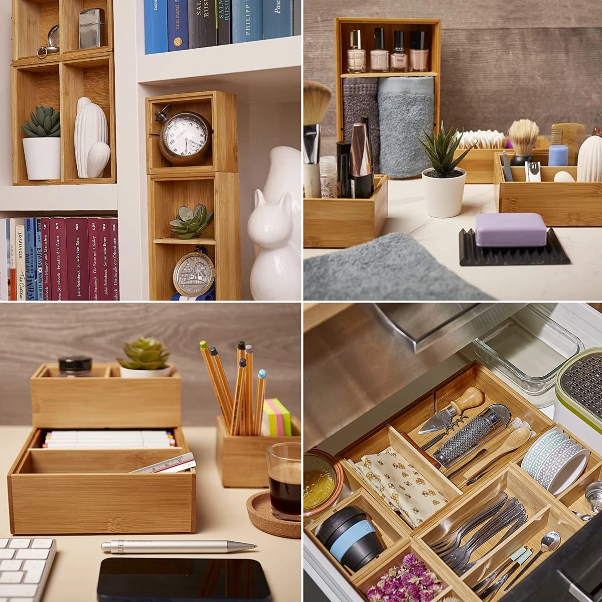 - Natuurlijk & Hoog-Kwaliteitsmateriaal – Het opbergsysteem voor lades is gemaakt van 100% milieuvriendelijk bamboe. Het hoogwaardige materiaal is duurzaam, bestendig en stijlvol tegelijk. Vuil kan gemakkelijk van het hout worden verwijderd met een doek en wat zeep. De dozen zijn niet vaatwasmachinebestendig.
