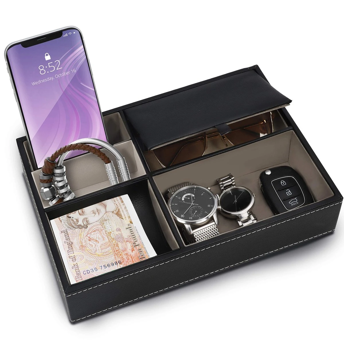 - FUNCTIONELE COMPARTIMENTEN: De 2 dunne gleuven zijn de perfecte maat om smartphones, afstandbedieningen en beurzen in te stoppen. Ze houden uw apparaten in een rechtopstaande positie, zodat ze makkelijk te pakken zijn en u ze niet meer kunt verliezen. De sectie met deksel is ontworpen om duurdere items en medicatie van stof weg te houden. Bewaar uw bril, sieraden en horloges. Er is een gekromd gedeelte in onze tray welke items als munten makkelijk laat pakken.
