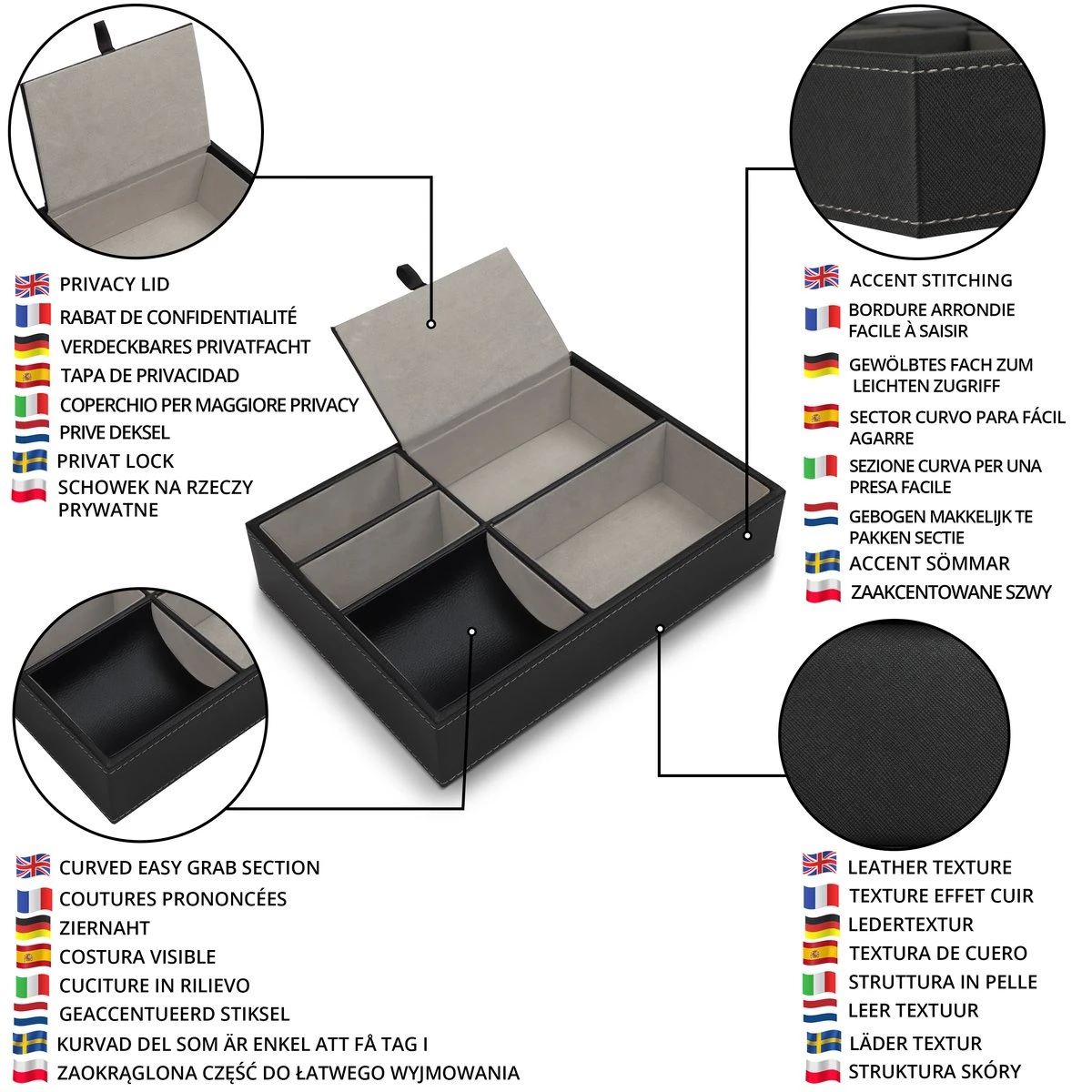 - ZWARTE ALLESVANGER LEREN BAK: Onze faux leren bak is 26 x 18,7 x 5,3 cm en heeft in totaal 5 compartimenten. Er zijn 2 kleine secties, welke 3,5 en 9 cm zijn, een compartiment met een deksel, weke 7,8 x 15 cm is, een gebogen makkelijk te pakken sectie van 9 x 9 cm en een extra grote sectie van 9 x 15 cm.