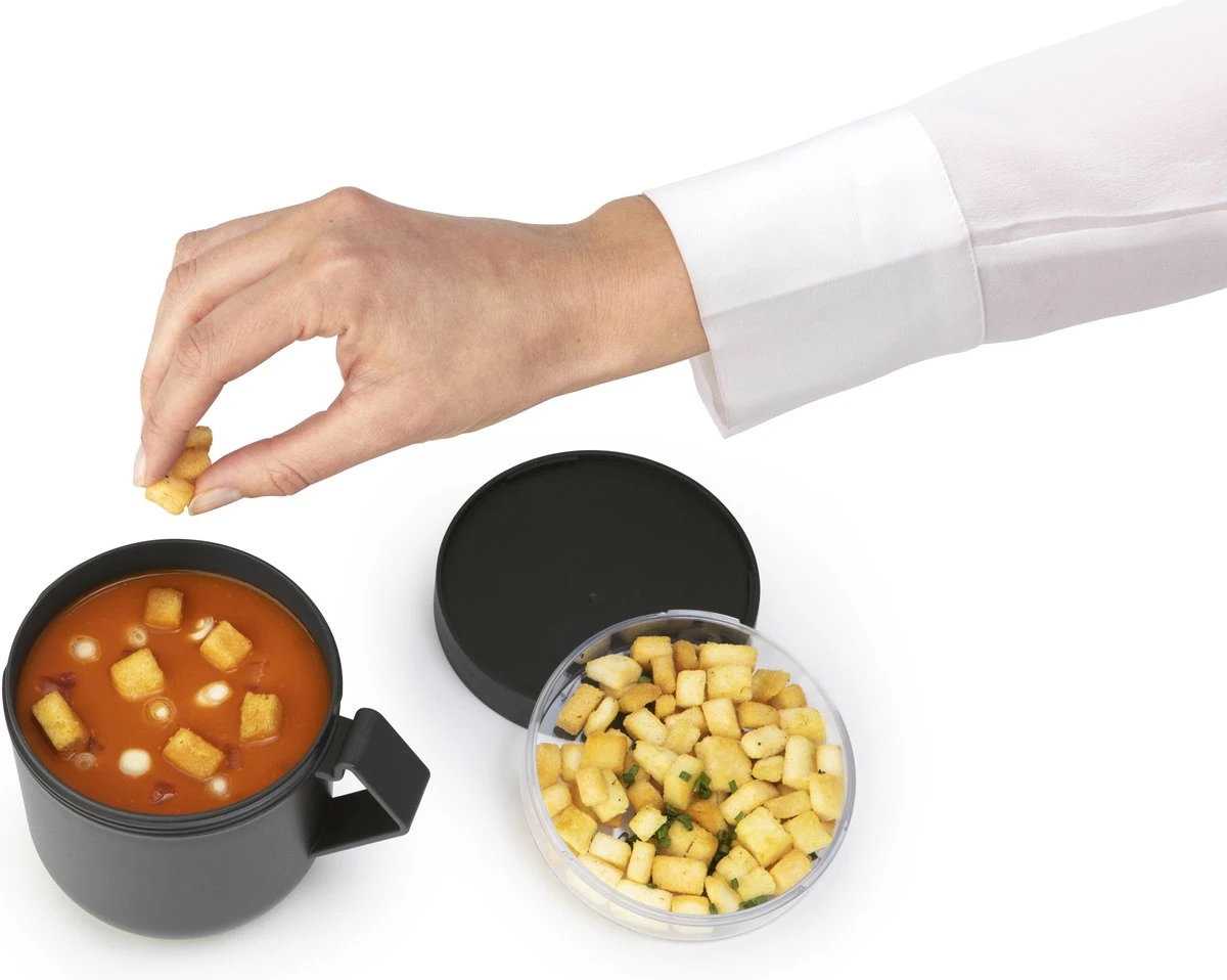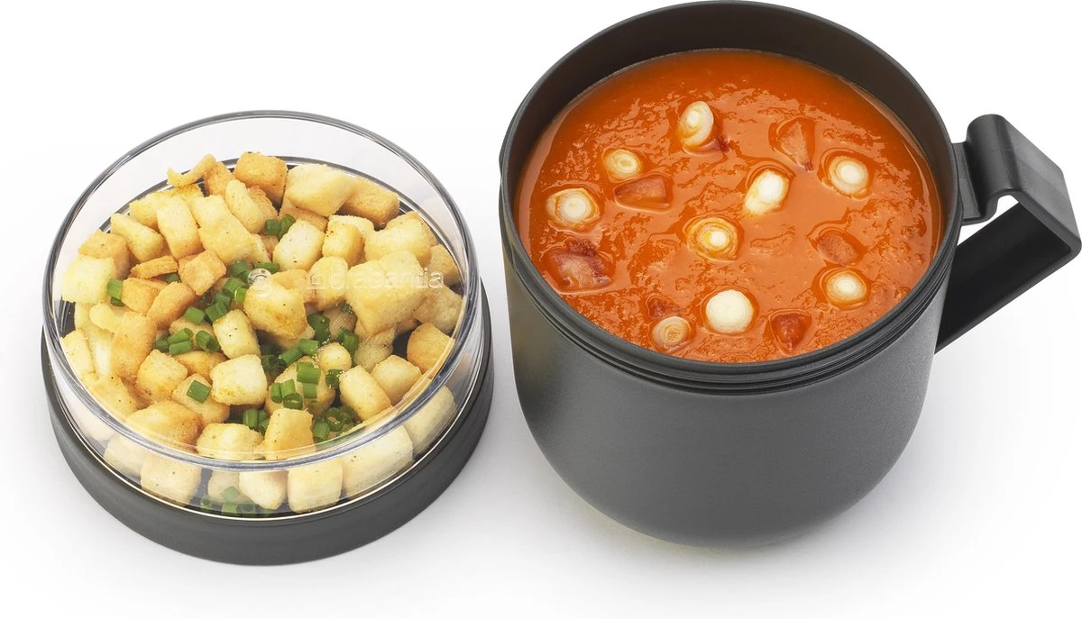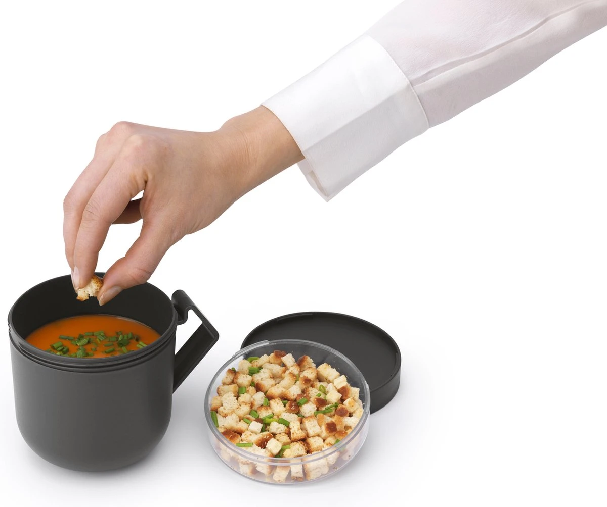 Neem je soep mee naar kantoor zonder geknoei met de Brabantia Make & Take soepbeker. In deze slimme soep-to-go beker past tot 600 ml van je favoriete bouillon en hij is natuurlijk magnetronbestendig. En om het helemaal af te maken, heeft deze wondermok een apart bakje voor je toppings wat je erop schroeft. Zo blijven je ingrediënten gescheiden en vers.