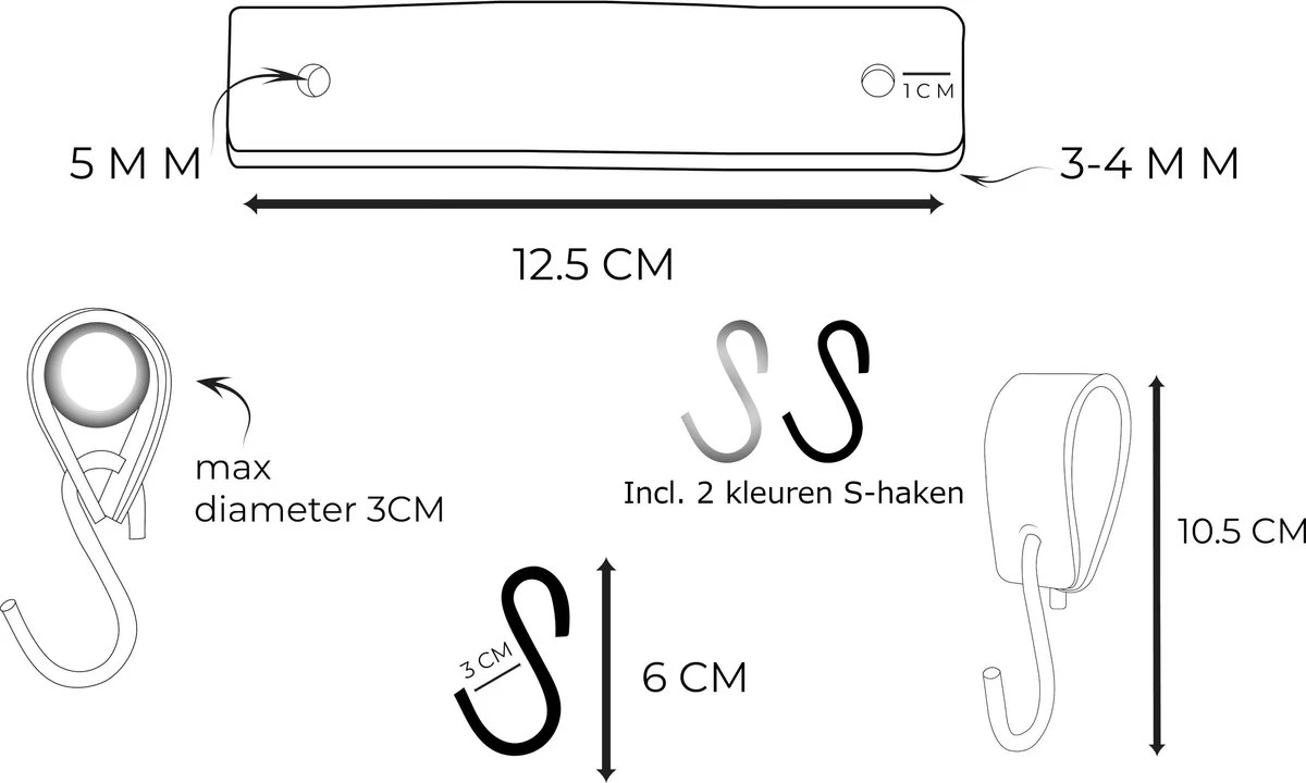 Iedere leren lus wordt geleverd met S-haken in twee kleuren: zilver en zwart.