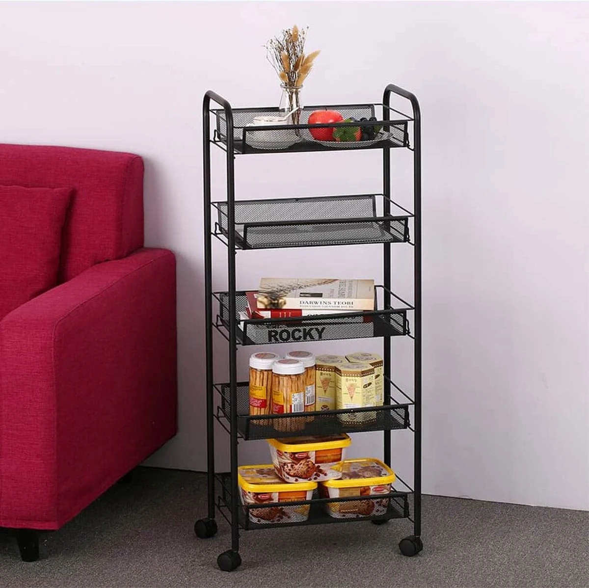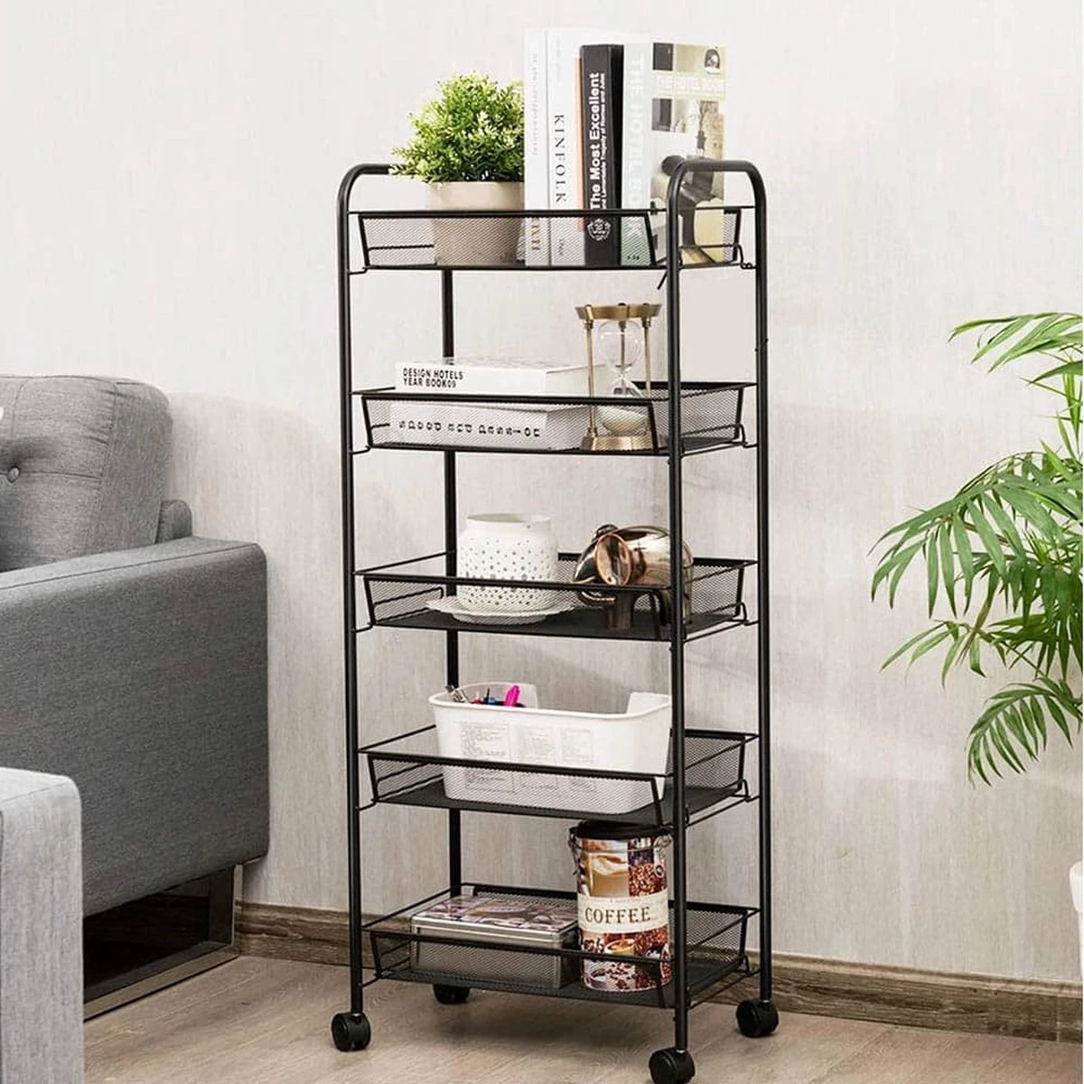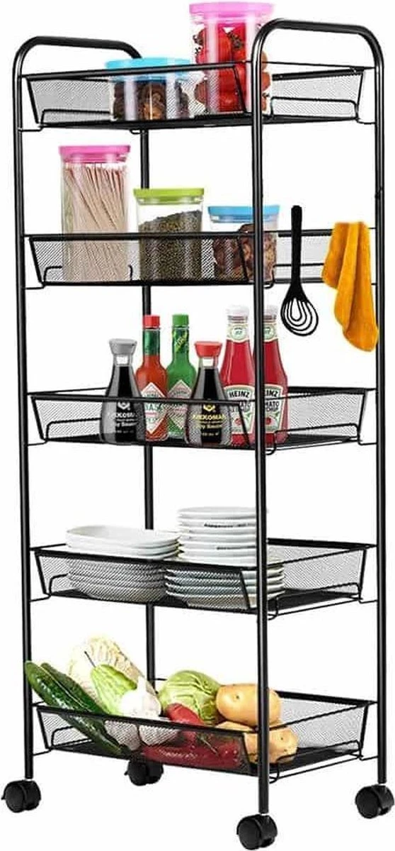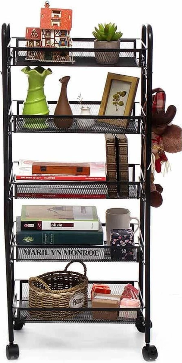 Heeft u last van spullen die overal rondzwerven en hebbben ze geen vaste plek? Dit rek op wieltjes is een super opbergplek. Door de vijf lagen kun je veel spullen kwijt en ze zelfs ook ordenen. Door de open vakken in het opbergrek is het overzichtelijk en ook stevig. Het rek rijdt op wieltjes waardoor het heel makkelijk te verplaatsen en dus niet veel ruimte opneemt. Het is een perfecte opbergplek voor in de keuken of in de badkamer. Door het moderne zwarte design past het binnen ieder interieur en is het geen doorn in het oog.