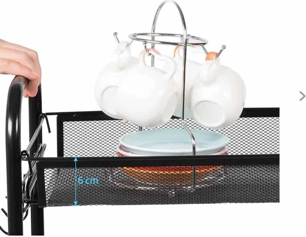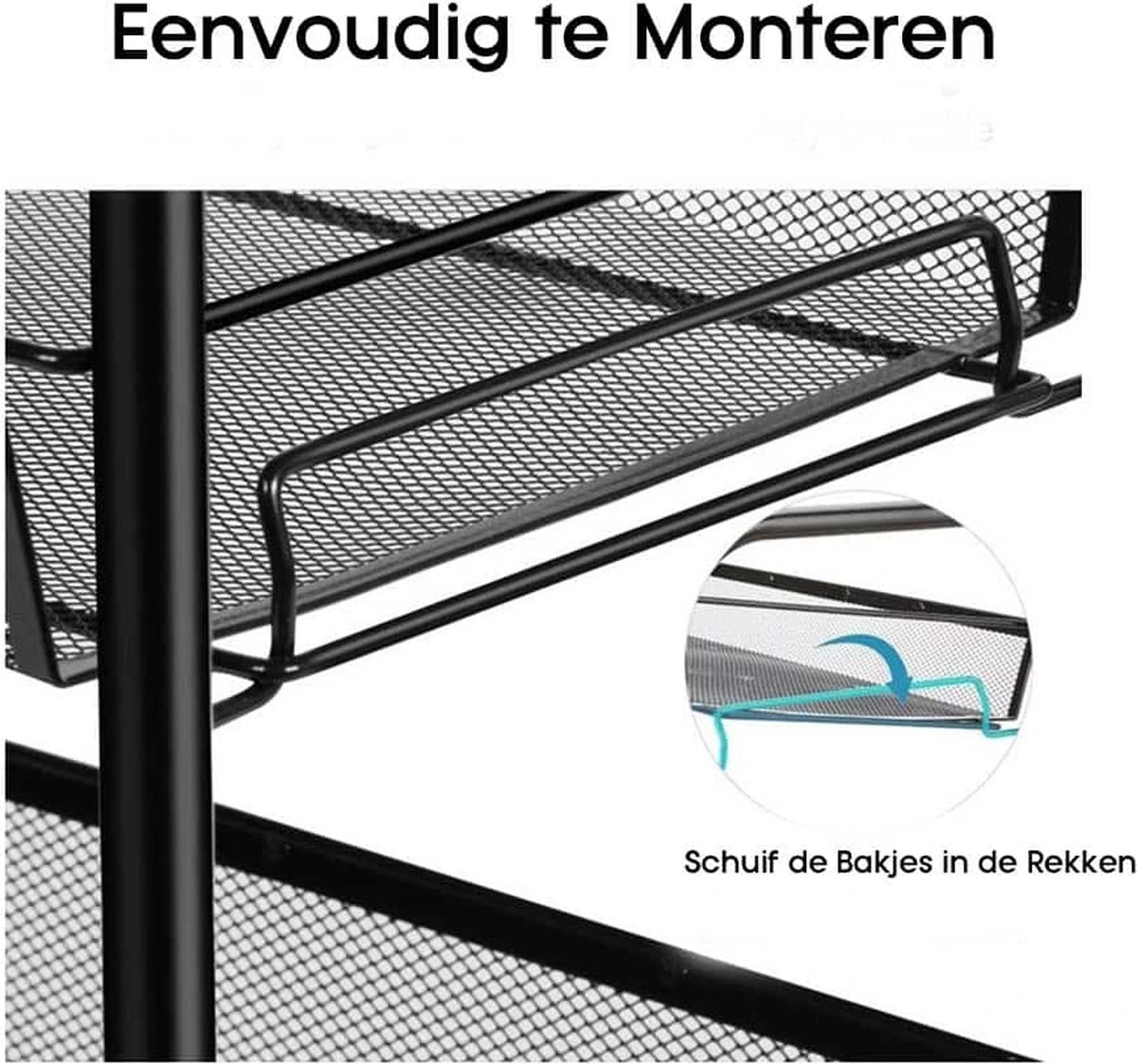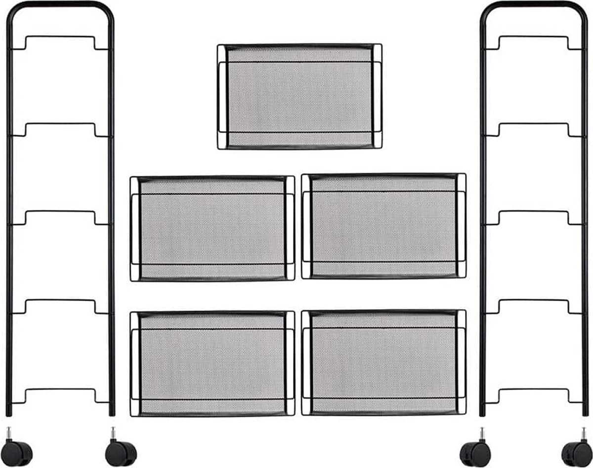 Heeft u last van spullen die overal rondzwerven en hebbben ze geen vaste plek? Dit rek op wieltjes is een super opbergplek. Door de vijf lagen kun je veel spullen kwijt en ze zelfs ook ordenen. Door de open vakken in het opbergrek is het overzichtelijk en ook stevig. Het rek rijdt op wieltjes waardoor het heel makkelijk te verplaatsen en dus niet veel ruimte opneemt. Het is een perfecte opbergplek voor in de keuken of in de badkamer. Door het moderne zwarte design past het binnen ieder interieur en is het geen doorn in het oog.