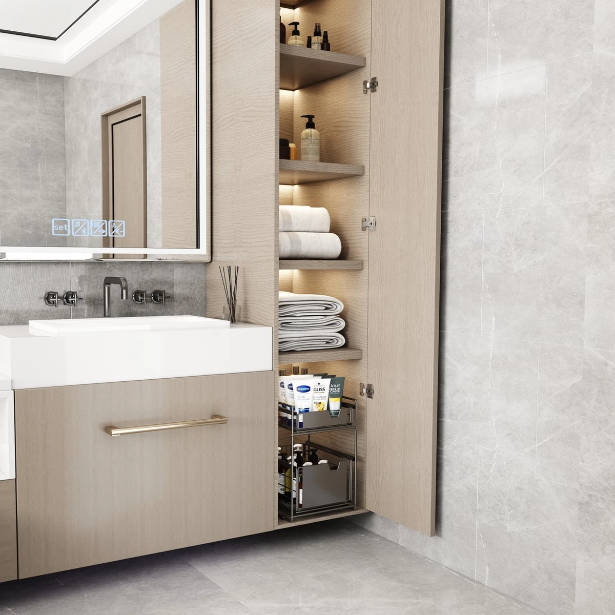 Het robuuste opbergrek kan naar wens ingedeeld worden door het twee-laagse lade systeem. Het opbergrek bestaat namelijk uit twee uitschuifbare lades. De lades zijn uitgerust met de nieuwste systemen voor de beste gebruiksvriendelijkheid. De onderste lade is ideaal om flessen in te plaatsen of andere hoge voorwerpen. Denk bijvoorbeeld aan wasmiddelen, reinigingsmiddelen, potten, boeken, enzovoort.