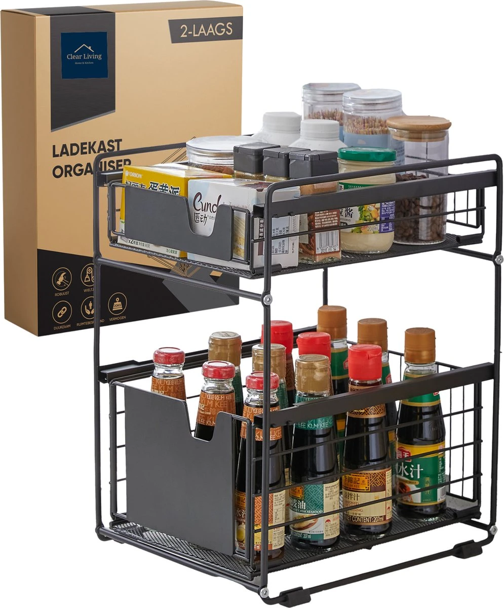 Maak iedere ruimte overzichtelijk met de gootsteenkast organizer van Clear Living. Creëer orde onder bijvoorbeeld de gootsteen, in de voorraadkast, op het aanrecht, in de badkamer, enzovoort. Deze twee-laagse organizer brengt organisatie in ruimtes waar dat moeilijk te realiseren is. Rommelige gootsteenkastjes en talloze overige ruimtes zijn op deze manier verleden tijd met ons opbergrek. Zet de gootsteenkast organizer in een aantal stappen eenvoudig in elkaar met behulp van een Nederlandse gebruikershandleiding.