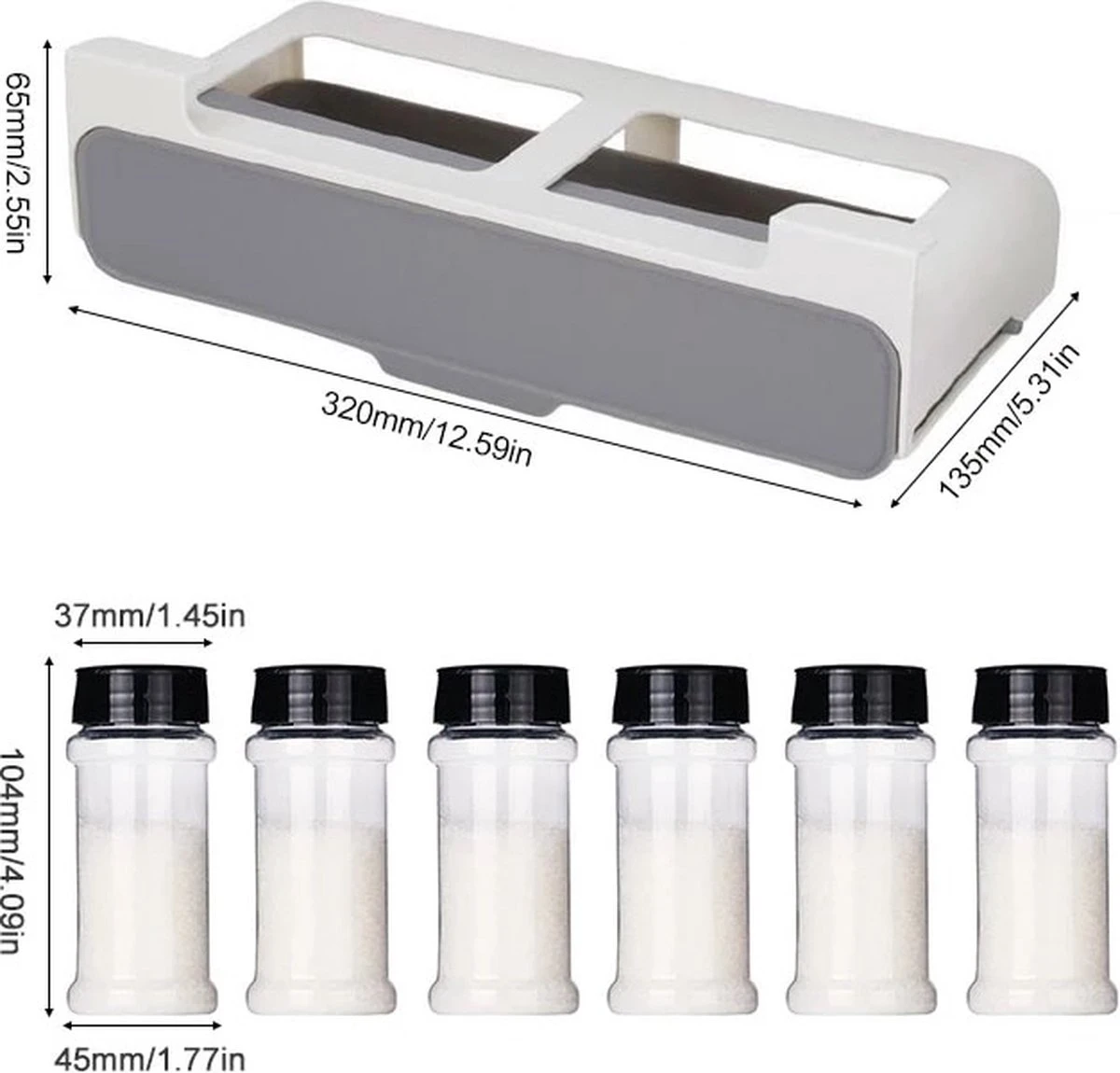 Het ophangbare kruidenrek heeft een afmeting van 32×13,5×6,5cm en is dus ruim 32cm lang, 14cm lang en 7cm hoog. Door deze compacte afmeting behoud je maximale ruimte in jouw keuken en past het dus overal onder. De potjes hebben een afmeting van 4,5×4,5×10,4cm en passen dus 7 maal in de organizer!