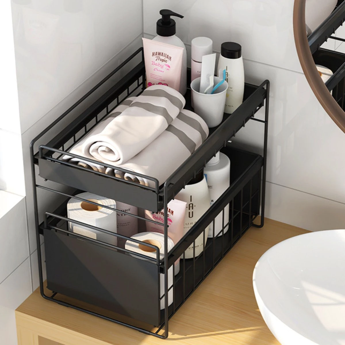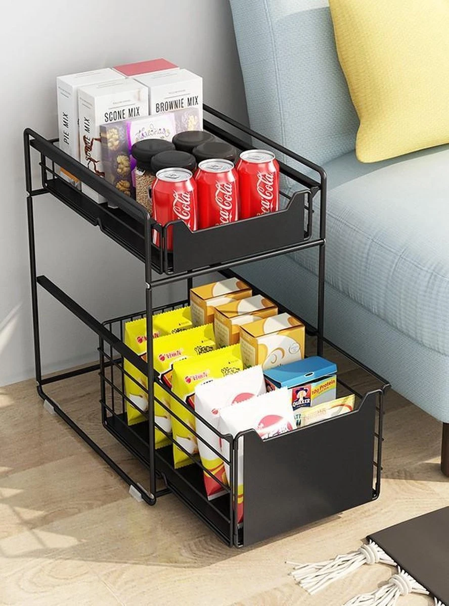 Zelfs de meest rommelige ruimtes worden dankzij deze organizer optimaal benut. Dankzij het ontwerp met twee lagen biedt de organizer ruimte voor een tal aan spullen. Beide lagen zijn voorzien van een opstaande rand om te voorkomen dat spullen omvallen. Doordat de lagen uitschuifbaar zijn is het heel eenvoudig om bij de achterste spullen te komen. Hierdoor hoef je niet meer het hele kastje in te kruipen en stoot je ook niet per ongeluk spullen om.
