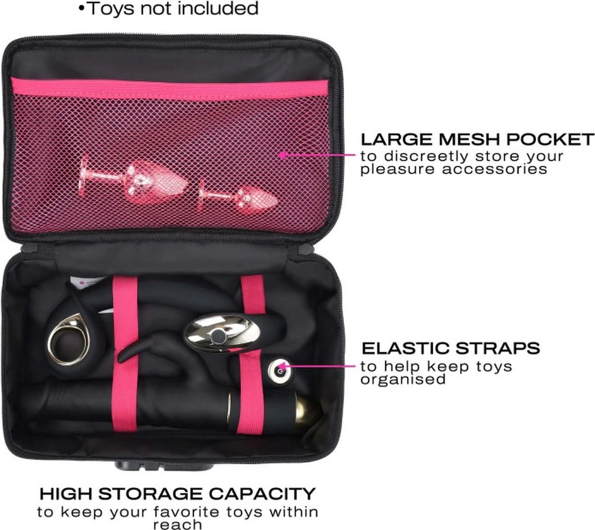 De Discrete Box van Dorcel is een veilige haven voor je seksspeeltjes en accessoires. Hij beschermt je speeltjes met een vast slotsysteem en een persoonlijke code. De capaciteit is 4-5 middelgrote speeltjes en het discrete ontwerp is perfect voor veilig reizen en opbergen. Het interne gaasvak en de elastieken houden accessoires en schoonmaakproducten perfect op hun plaats. De opbergbox heeft een 3-cijferig combinatieslot zodat u niet het riscio loopt dat u uw sleutel verliest.