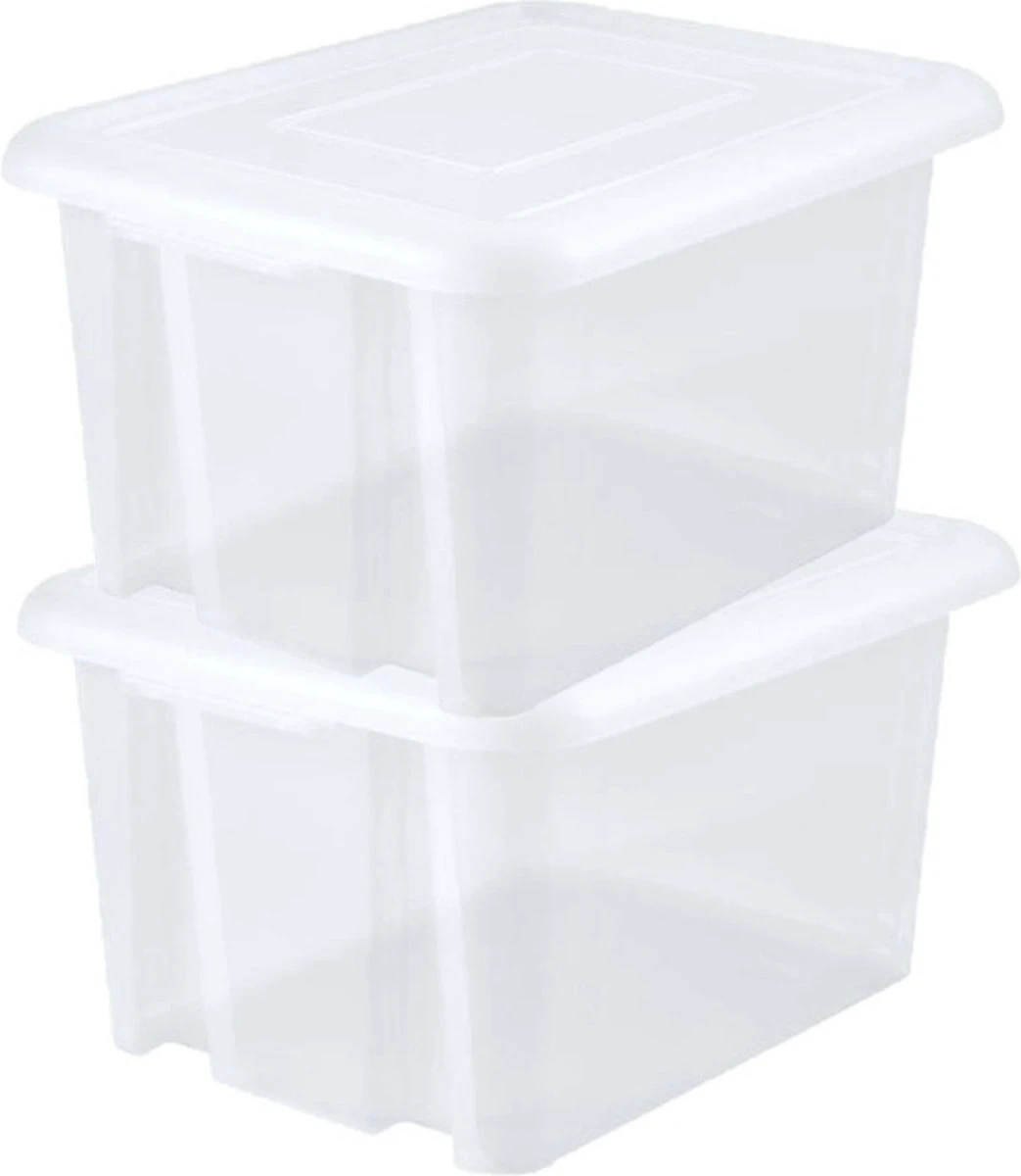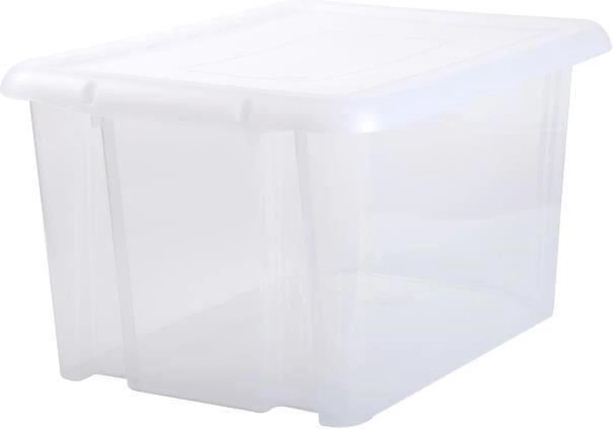 Opbergbox/opbergdoos stapelbaar. Multifunctionele opberger voor het vocht- en stofvrij opbergen van een grote variatie spullen. De box is makkelijk te stapelen voor optimaal opberggemak. Ook is hij voorzien van handige en stevige sluitclips zodat het deksel goed op zijn plaats blijft. Inhoud: 80 liter. Afmeting (lxbxh) ca: 65 x 50 x 36 cm. Kleur: transparant wit. Materiaal: kunststof.