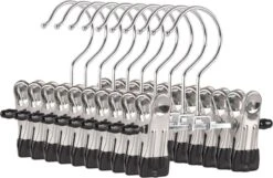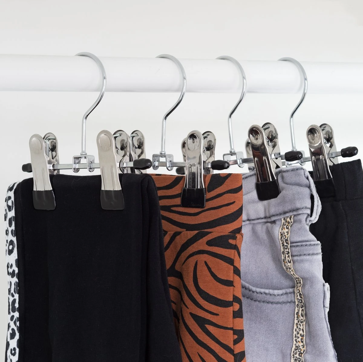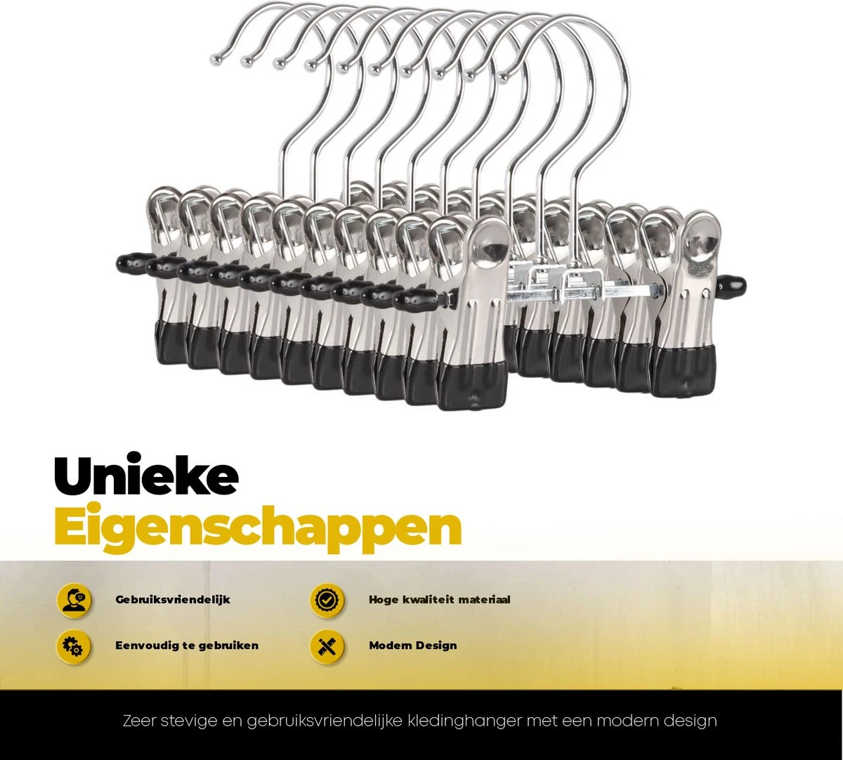 De stevige kleine broekhouders zijn multifunctioneel ontworpen. Zo zijn de kleerhangers uiterst geschikt voor het overzichtelijk ophangen van babykleding. De broek of pantalon kan gemakkelijk aan de klipjes worden gehangen en daarna in de kast worden geplaatst. Zo bergt u uw babykleding netjes en overzichtelijk in de kledingkast op. Bovendien kunnen de hangers gebruikt worden als laarzenhouder. De hangers zijn gemaakt van metaal en zijn zilver van kleur. De klippers van de hangers zijn gemaakt van plastic, hier zitten geen scherpe randen aan om schade op de kleding te voorkomen. De kledinghangers zijn zeer compact, waardoor ze een ruimtebesparende werking hebben en door de 10 stuks bent u direct klaar om uw kledingkast overzichtelijk in te delen.