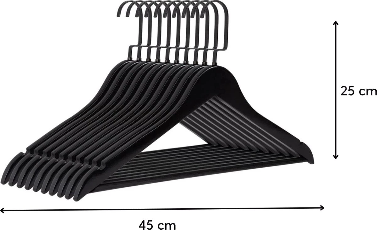 De stevige kledinghangers zijn multifunctioneel ontworpen. Zo zijn de kleerhangers uiterst geschikt voor het overzichtelijk ophangen van pakken. De broek of pantalon kan netjes op het middenstuk van de hanger worden gehangen, de blazer om de kleerhanger heen. Zo bergt u uw pak netjes en overzichtelijk in de kledingkast op. Daarnaast is de suit hanger multifunctioneel te gebruiken voor truien, t-shirts, broeken, jurken, pakken en overhemden. De hangers zijn gemaakt van massief hout en hebben een zwarte kleur. Bovendien heet de hanger een luxe, platte zwarte haak, die mooi past bij de kleur. De kledinghangers zijn zeer compact, waardoor ze een ruimtebesparende werking hebben en door de 15 geleverde stuks bent u direct klaar om uw kledingkast overzichtelijk in te delen.