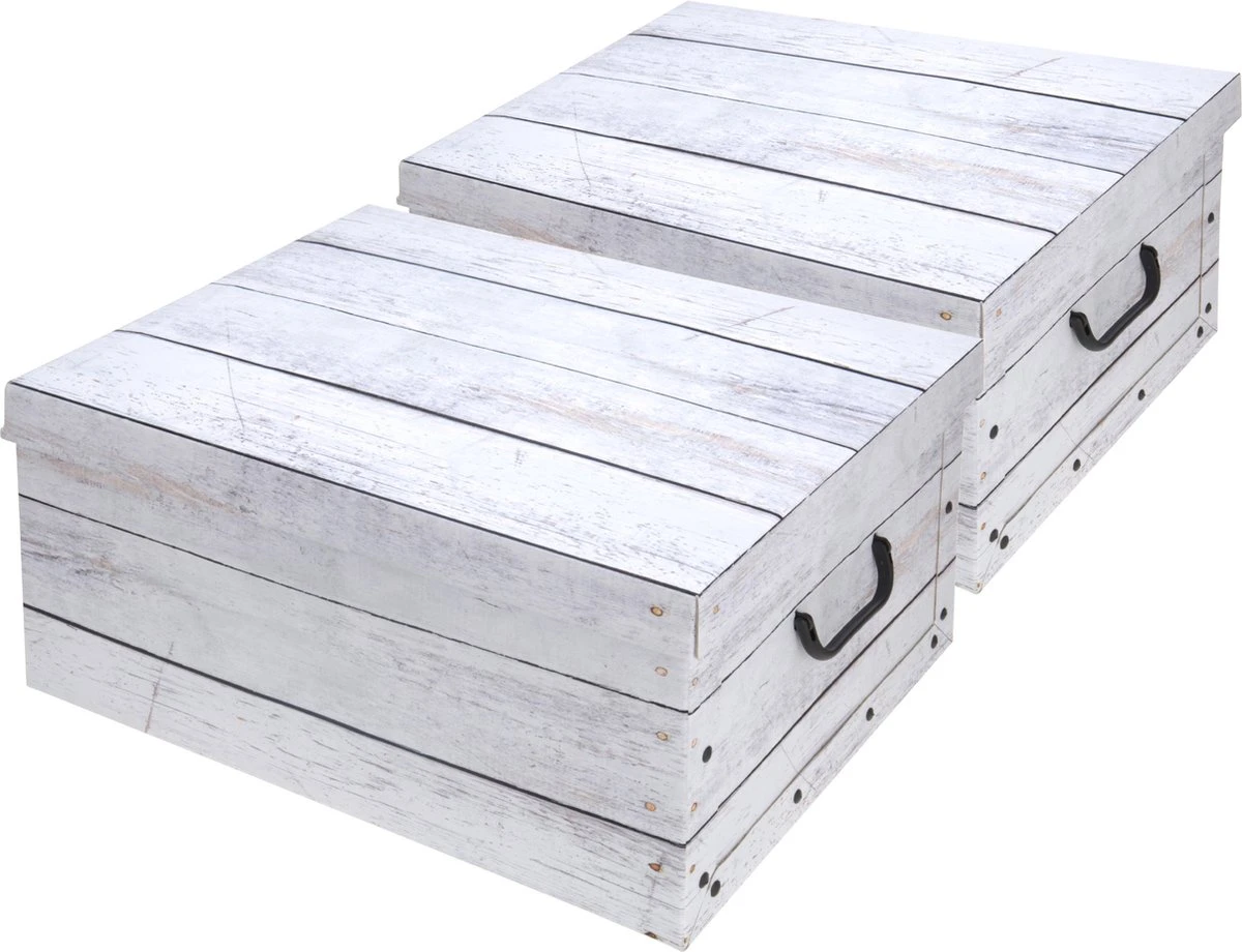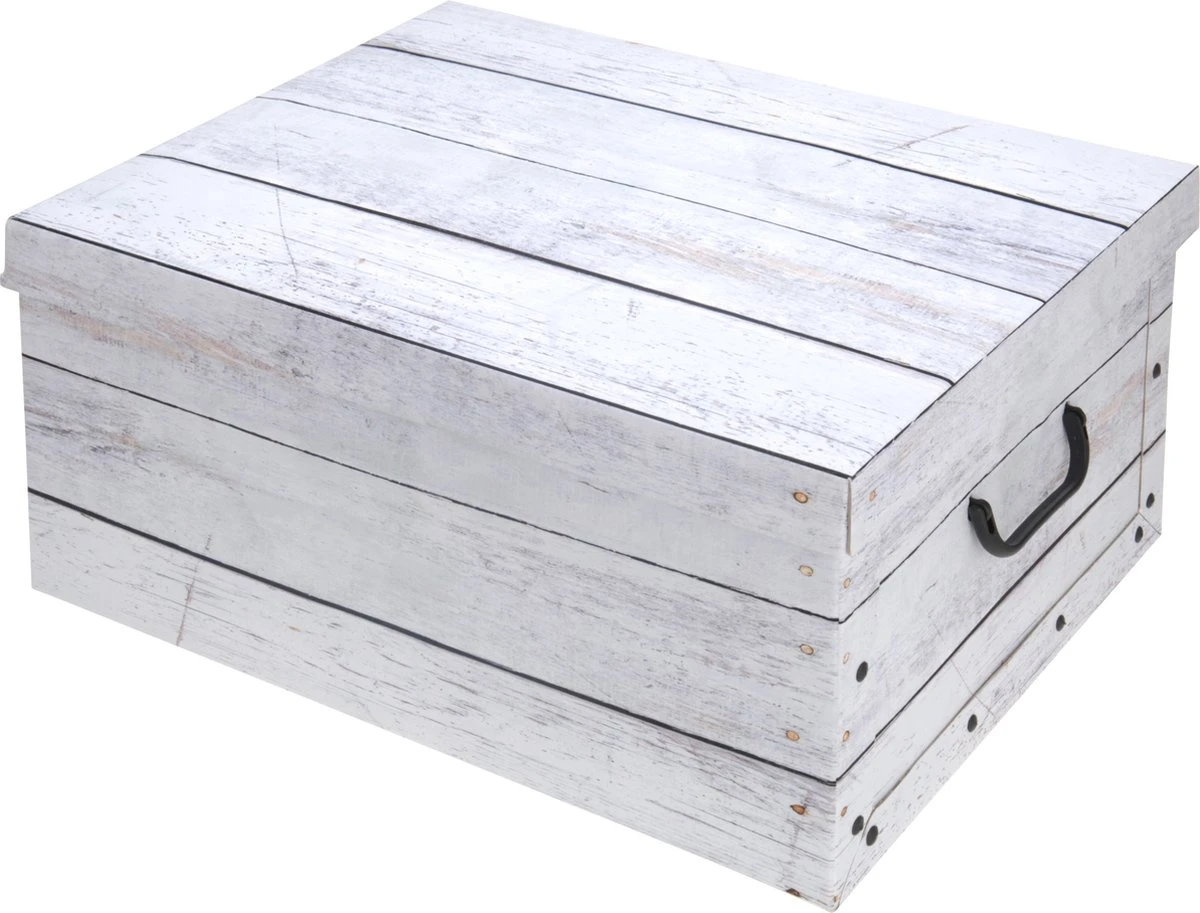Opbergdoos/opberg box van karton met hout print wit. Kartonnen opbergbox met deksel en handvatten. Formaat: ca 37 x 30 x 16 cm.