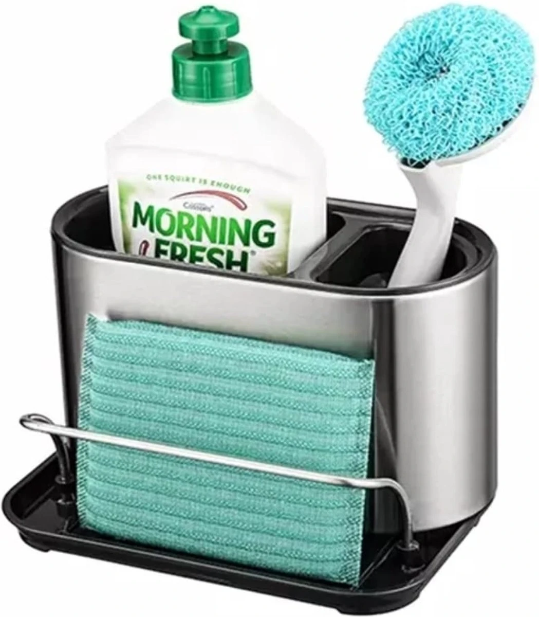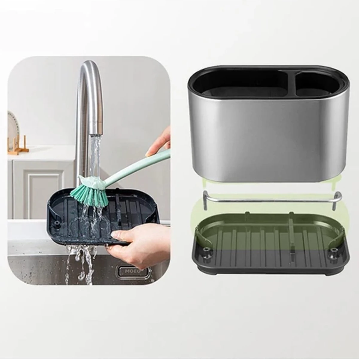 Elk onderdeel van onze gootsteenorganizer kan worden gedemonteerd en eenvoudig worden schoongemaakt. Het heeft een verwijderbare plastic lekbak die voorkomt dat restwater van borstels, schrobbers, poetslappen en sponzen op uw werkblad terechtkomt. U hoeft alleen maar de bak op te pakken om het resterende water in de lekbak te gieten en uw werkblad droog en hygiënisch te houden.