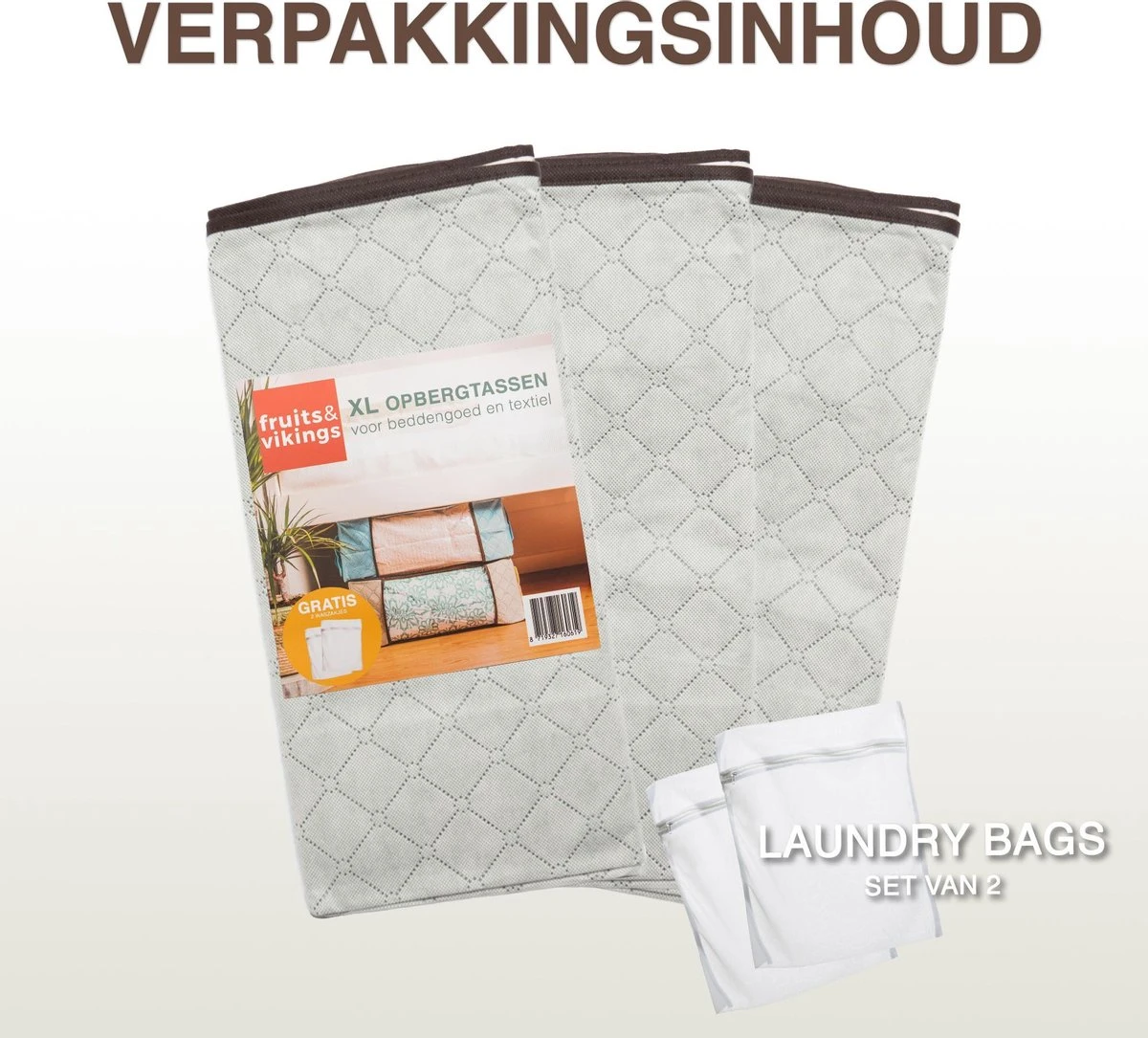 Met de Fruits & Vikings opbergtassen gaan je spullen langer mee! Milieuvriendelijk luchtdoorlatend materiaal beschermt jouw spullen tegen nare luchtjes en vochtschade. En als je jouw spullen weer nodig hebt, haal je het weer netjes en schoon tevoorschijn! Bovendien blijft de inhoud vrij van stof en schimmel en houd je textiel of kleding ver uit de buurt van motten.