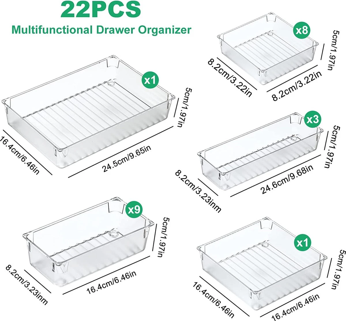 Het is tijd om de lades te ordenen! De 22-delige ladeset is ideaal voor het classificeren van cosmetische gereedschappen,haaraccessoires,nagellak,sieraden,servies, tandpasta,kammen,kantoorbenodigdheden,enz.Je vindt ze sneller terug.
