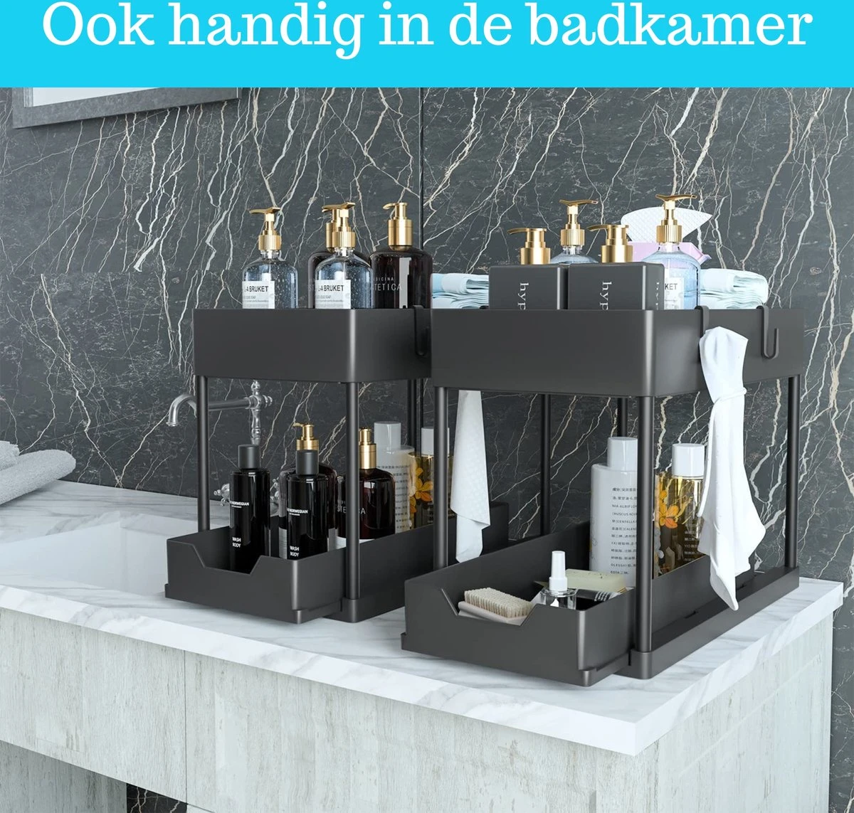 Nooit meer een rommeltje in uw keukenkastjes? Zin in een opgeruimde keuken? Dan zijn de keuken organizers van Gohh® een ideale uitkomst! De Gohh® Keukenkast Organizer is compacte vorm gegeven, waardoor hij gemakkelijk onder de gootsteen past. Hij is voorzien van twee opbergvakken, waardoor u meer dan voldoende ruimte hebt voor het opbergen van uw spullen. De antislip onderkant zorgt vervolgens voor optimale stabiliteit, waardoor hij niet onnodig verschuift. Het monteren van de organizer kost slechts 1 minuut, waardoor u ze direct kunt gebruiken.