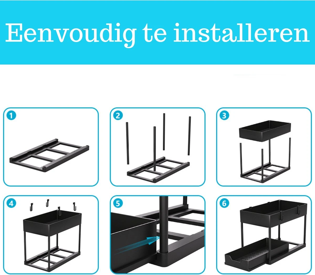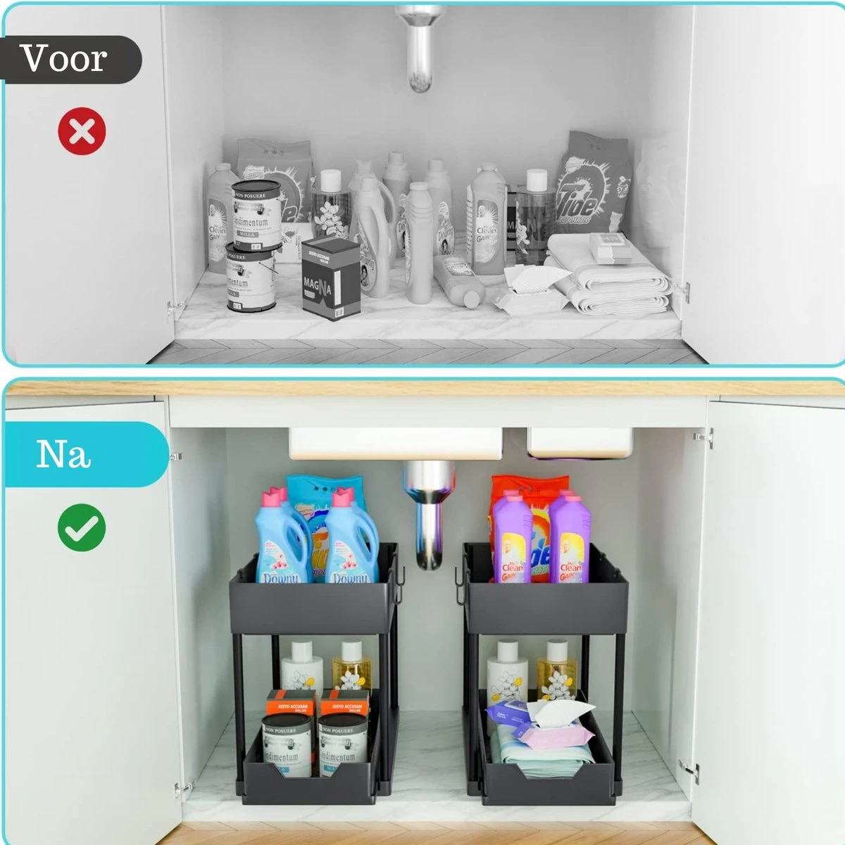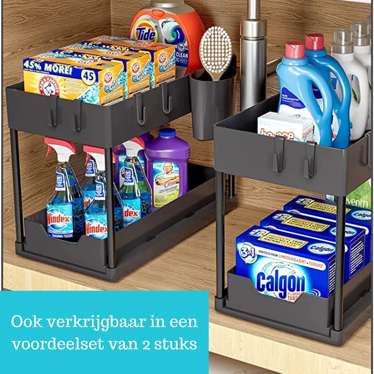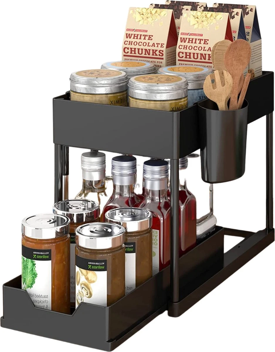 Nooit meer een rommeltje in uw keukenkastjes? Zin in een opgeruimde keuken? Dan is de keuken organizer van Gohh® een ideale uitkomst! De Gohh® Keukenkast Organizer is compacte vorm gegeven, waardoor hij gemakkelijk onder de gootsteen past. Hij is voorzien van twee opbergvakken, waardoor u meer dan voldoende ruimte hebt voor het opbergen van uw spullen. De antislip onderkant zorgt vervolgens voor optimale stabiliteit, waardoor hij niet onnodig verschuift. Het monteren van de organizer kost slechts 1 minuut, waardoor u hem direct kunt gebruiken.