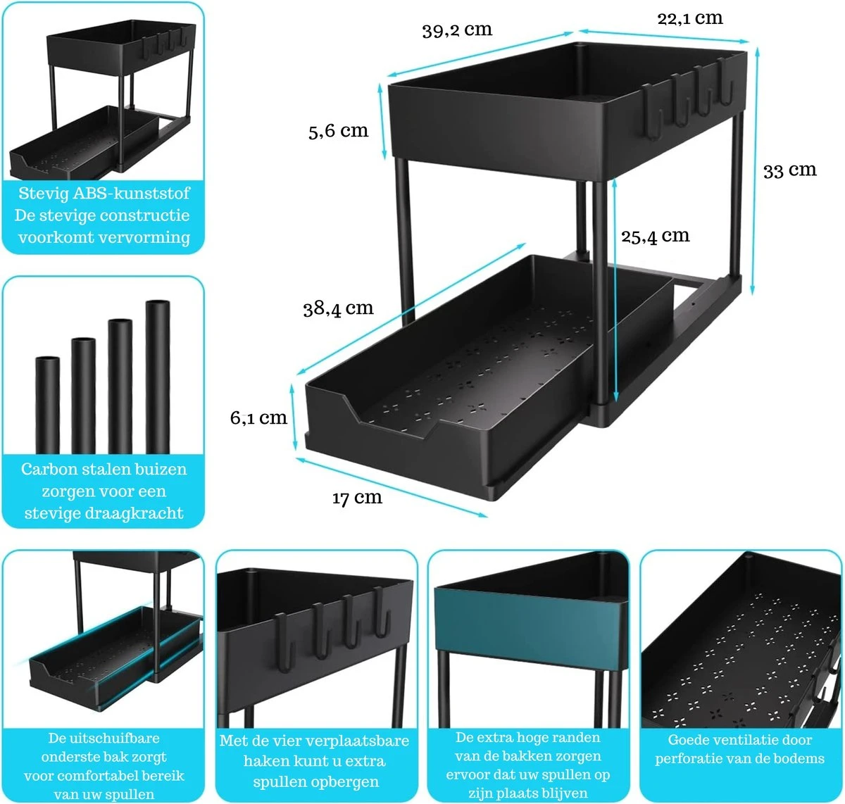 De organizer is gemaakt van kwalitatief hoogwaardig ABS-materiaal en carbonstaal en beschikt over een uitmuntend afwerkingsniveau. Hierdoor is de gootsteen organizer zeer stevig en duurzaam in gebruik, zodat u er jarenlang plezier aan kan beleven zonder dat de kwaliteit minder wordt.
