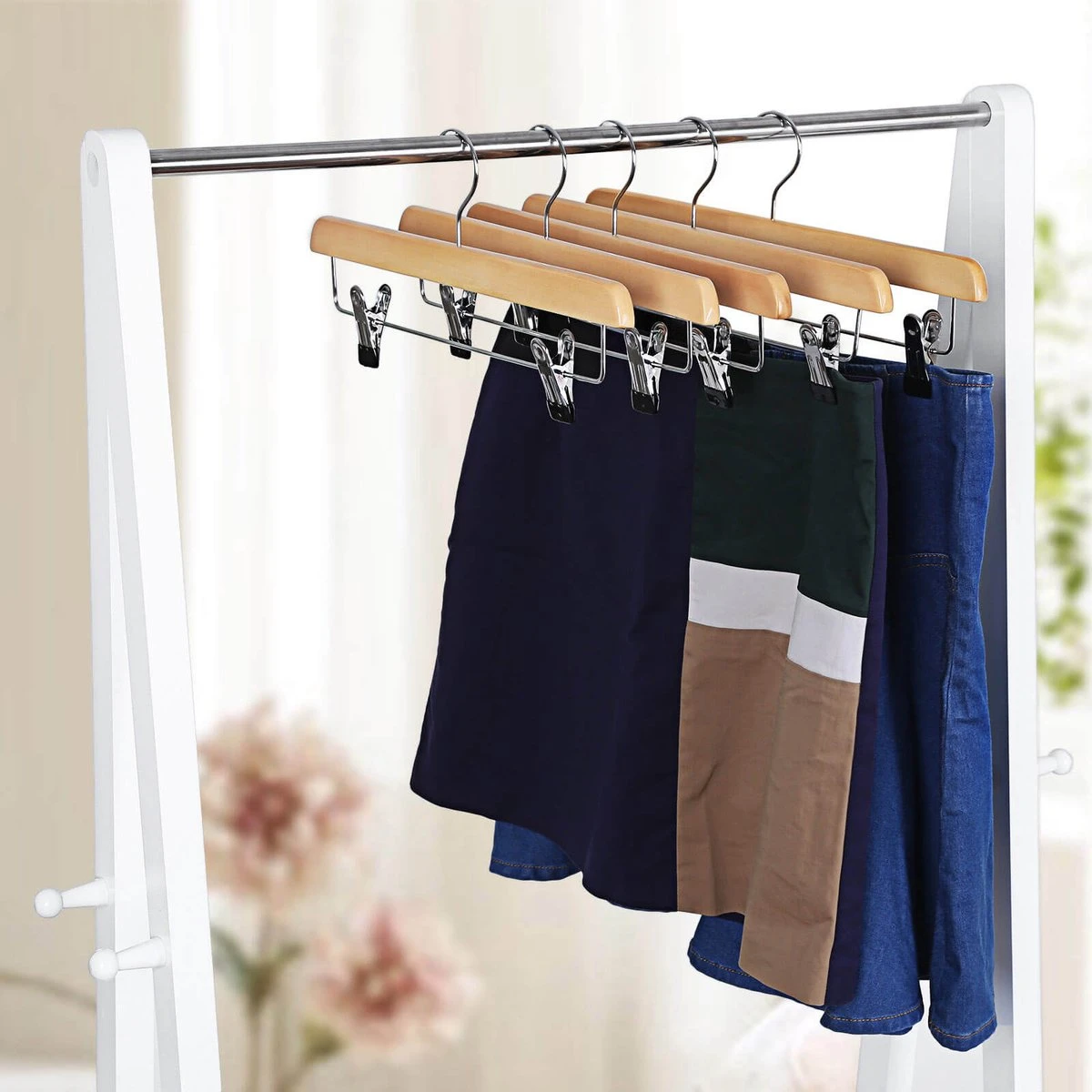 Wat je krijgt: 8 massief houten beugels voor rokken en broeken. die beschikken over slipvaste. met kunststof gecoate clips voor een sterke grip en een draaikaak voor het eenvoudig ophangen en verwijderen van je kleding