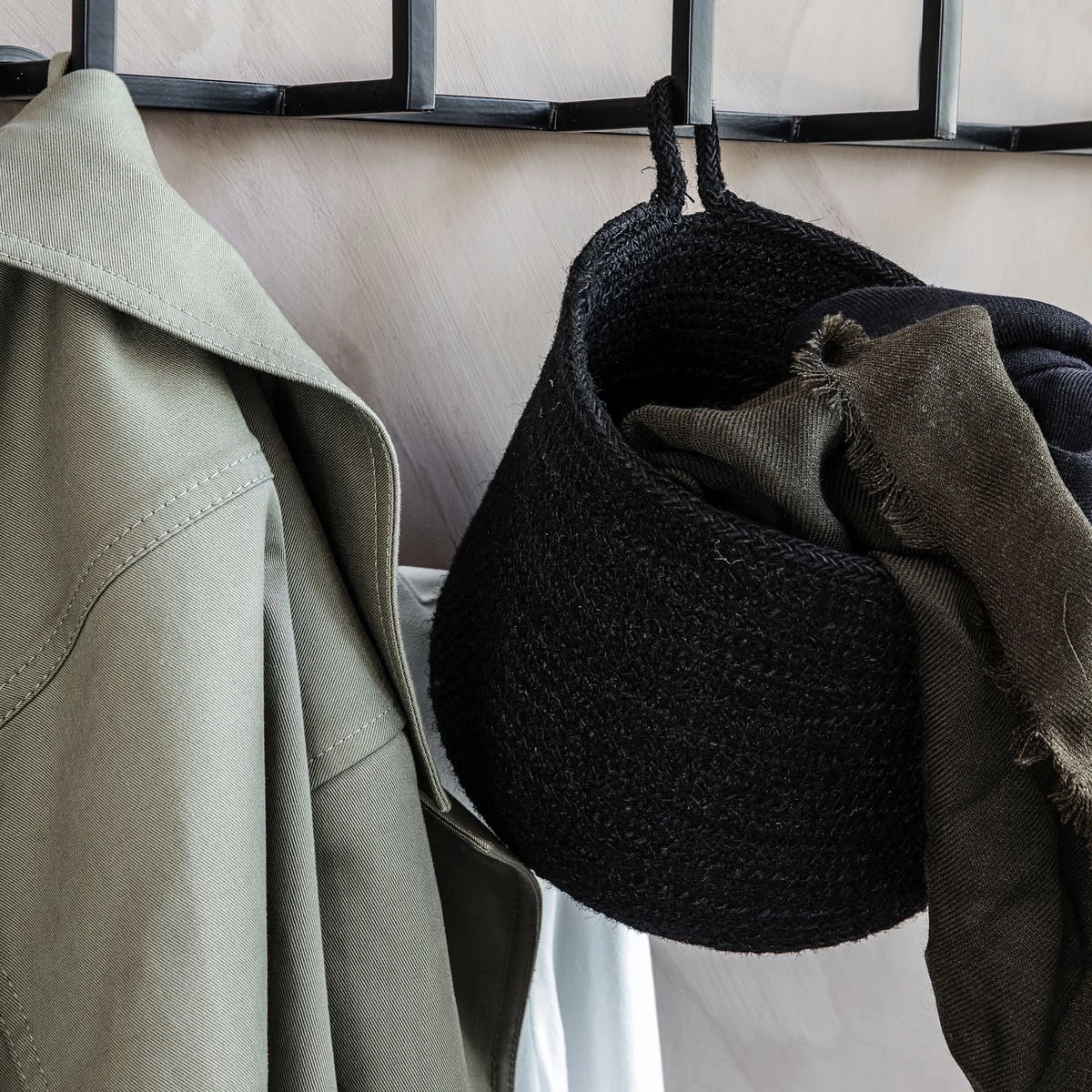 Deze mooie mand heet Hang en is perfect om je dagelijkse spullen in op te bergen zodat je ze dicht bij de hand hebt. Hang heeft een kleine lus aan het eind van de mand – hierdoor kun je de mand aan een haak ophangen. Je kunt Hang in de keuken gebruiken om de handdoeken op te hangen of voor tijdschriften in de woonkamer. In elk geval zal het decoratief zijn in je interieur en een perfecte opbergoplossing. De prachtige mand is gemaakt van zeegras in een zwarte kleur, is 16 cm hoog en heeft een diameter van 18 cm.
