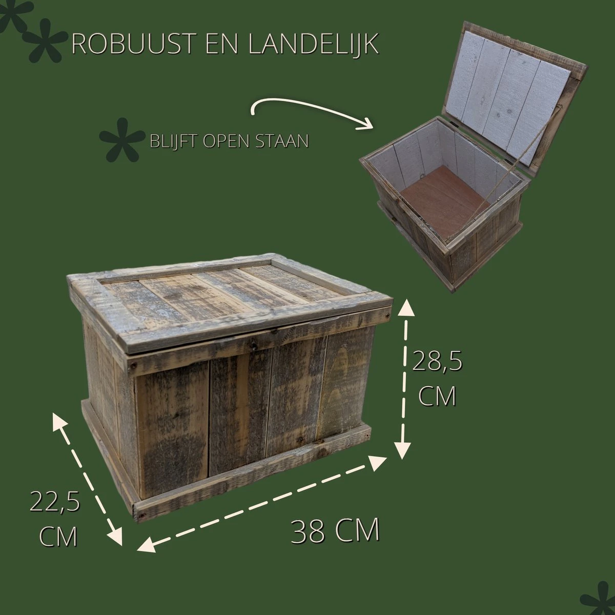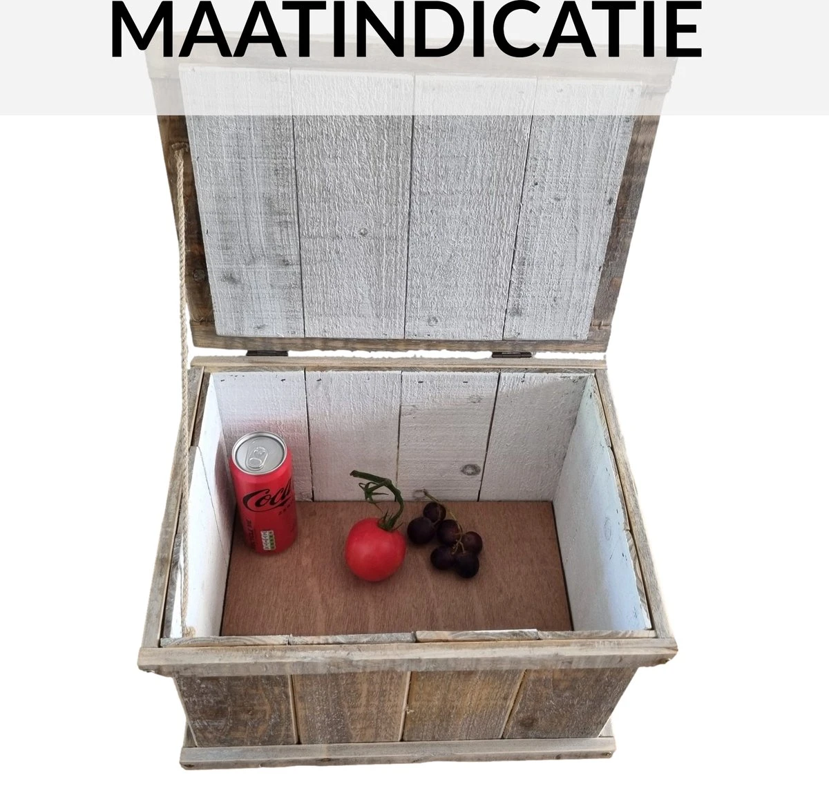 De binnenkant van het kistje is wit, om de landelijke look af te maken. Verder is de deksel van het kistje handig open te houden door het robuuste koord dat eraan bevestigd is. Het kist is 28.5x38x22.5cm en heeft daarmee een praktische grootte voor plaatsing in het gehele huis. Een echte toevoeging in ieders keuken of woonkamer.