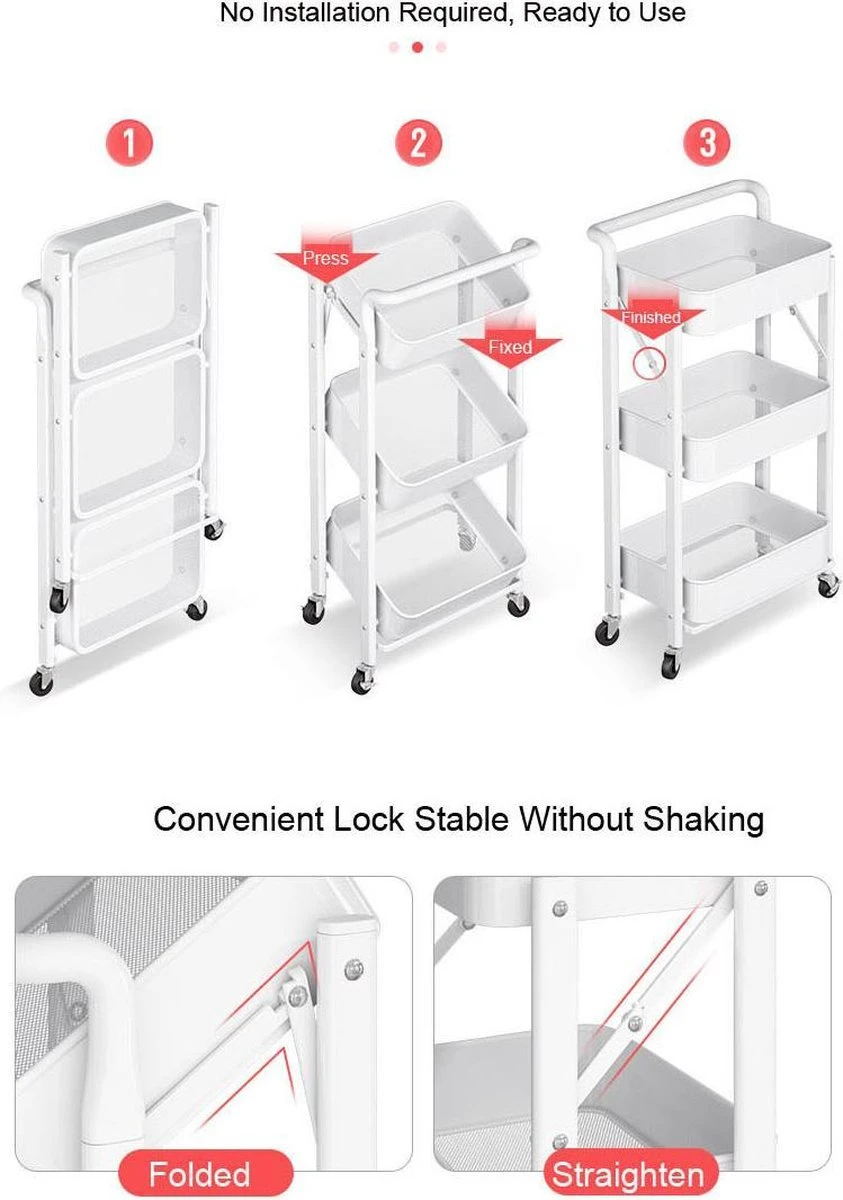 Deze trolley op wieltjes wordt geleverd met 3 mand vormige planken, ideaal om items op hun plaats op te slaan, vooral KLEINE items. De antislip materiaal voorkomt dat voorwerpen vallen bij het verplaatsen van de trolley. Dat is ideaal vooral als je de trolley als serveerwagen wilt gebruiken.