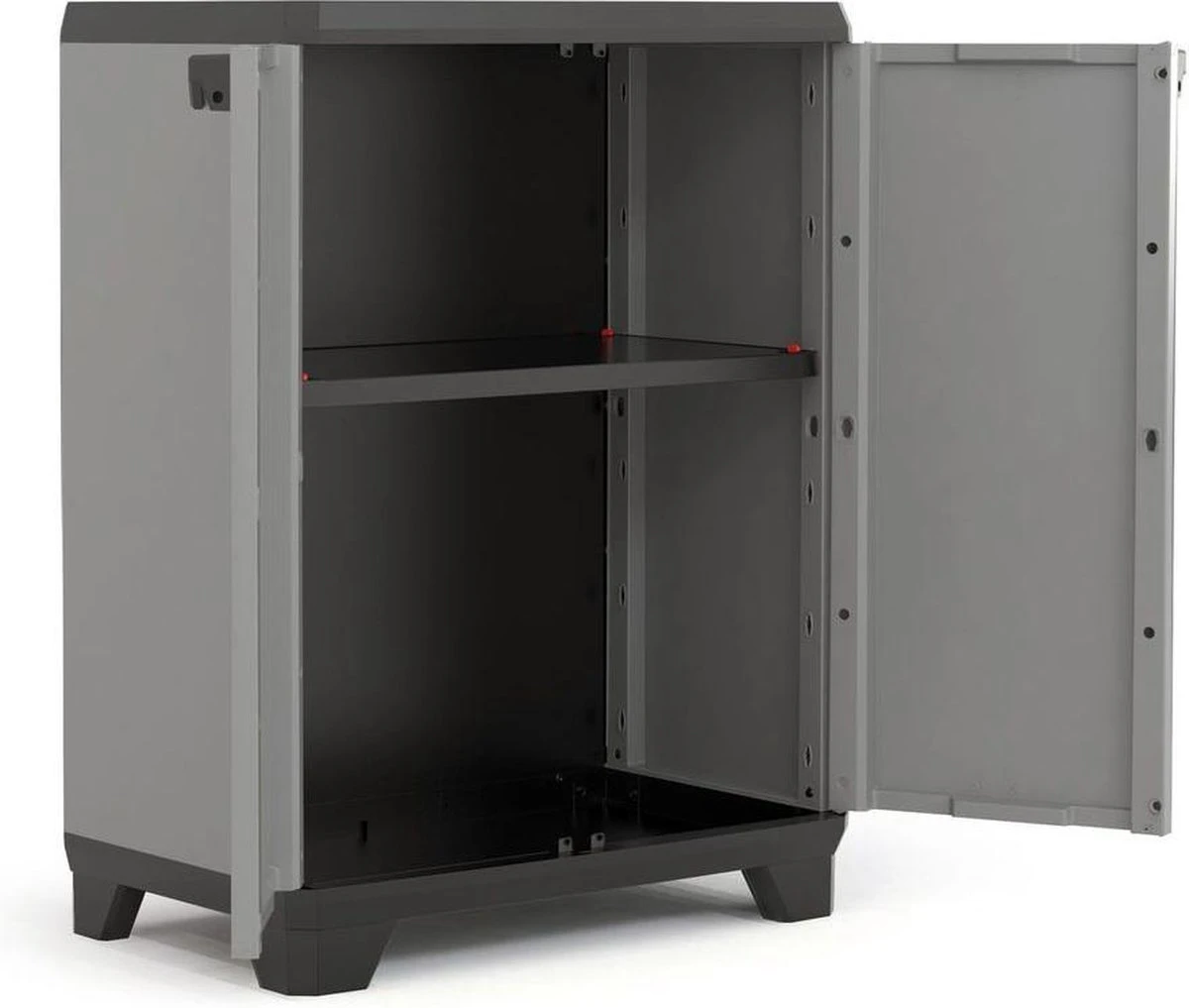De Keter Stilo Lage kast heeft een moderne uitstraling met de rode en zwarte accenten is Stilo een opbergmeubel dat ook in het oog springt. De lage kast heeft 1 verstelbare legplank met een capaciteit van 15 kg. Stilo heeft ook afsluitbare deuren en soft-touch handgrepen.
