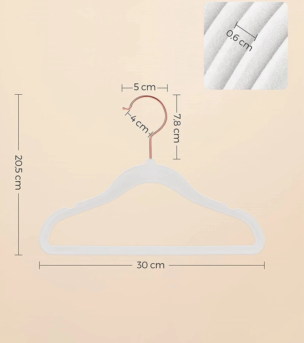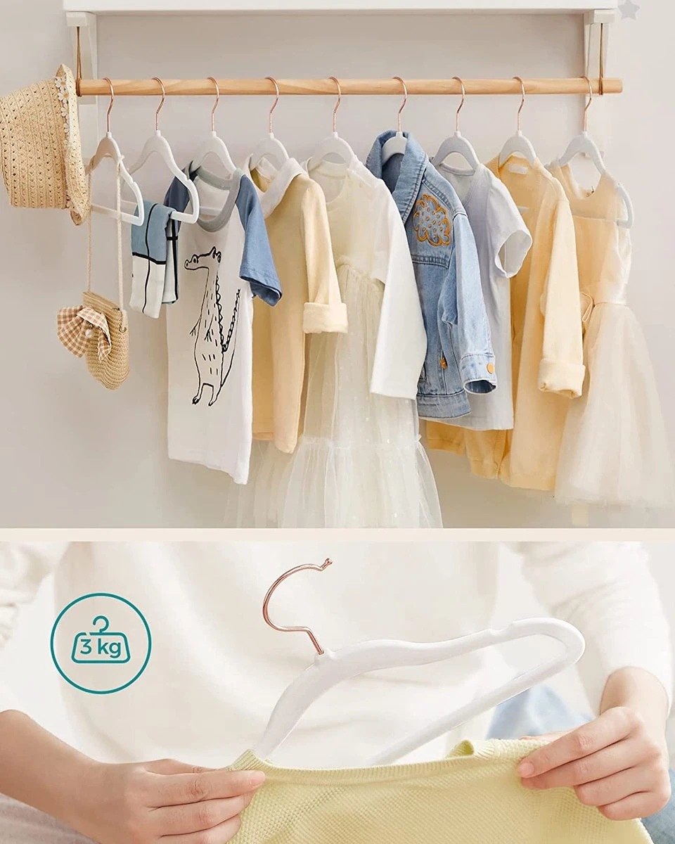 FLUWEEL ALS HOUVAST: vallen je kleren vaak op de vloer van de kleerkast? Deze 30 witte en zachte fluwelen kleerhangers houden de kinderkleren stevig op hun plaats.