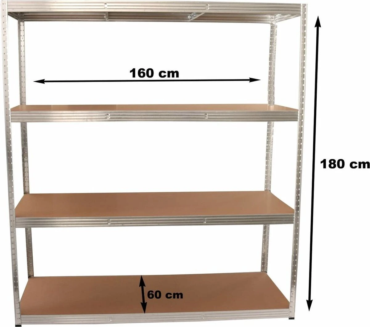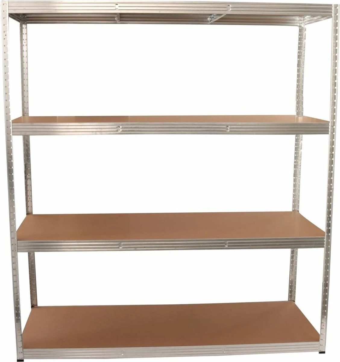 Zware rekken met 4 MDF-planken met elk een draagvermogen van 250 kg – praktisch insteeksysteem.