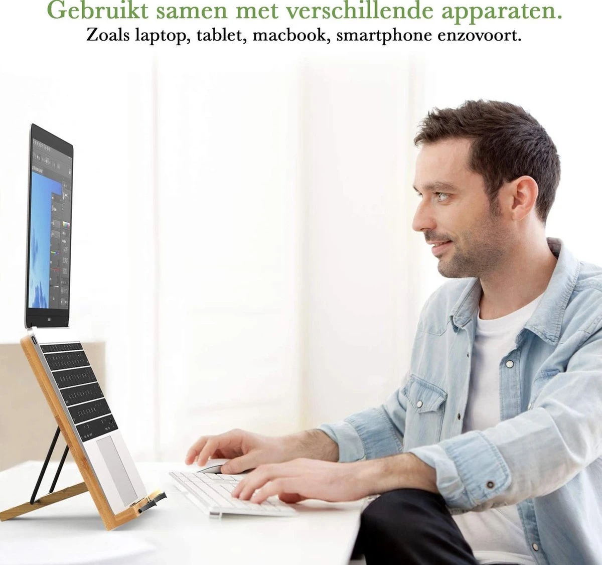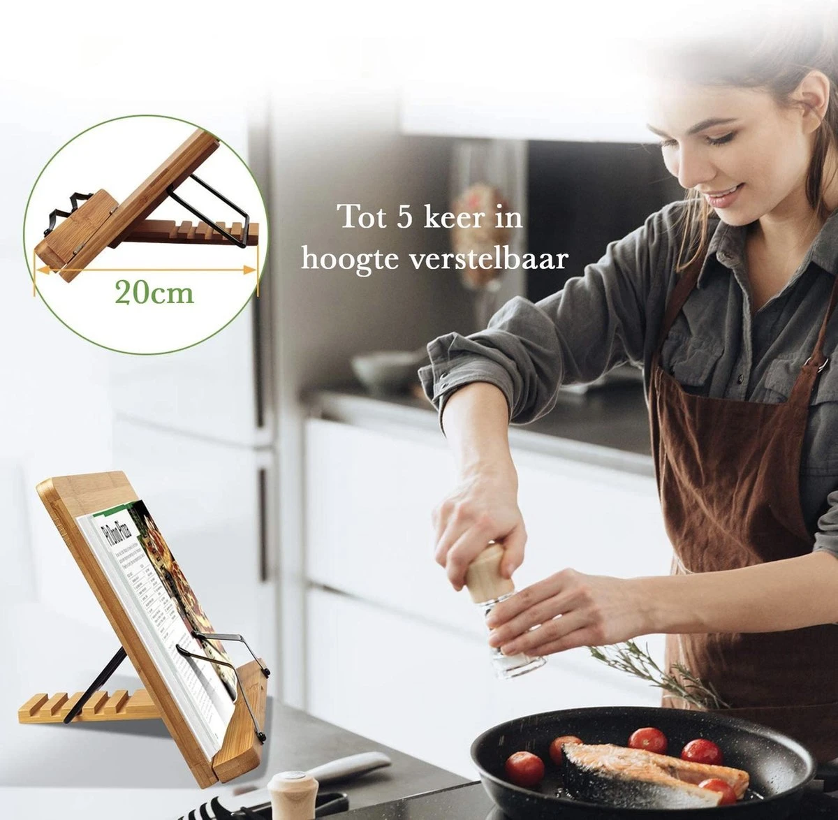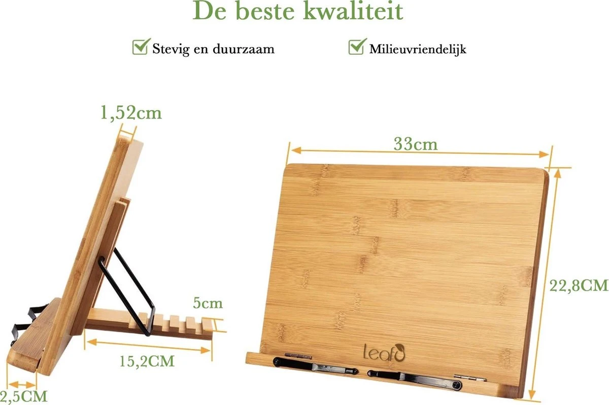 Deze 100% Milieuvriendelijk en duurzaam LeafU Bamboe boekenstandaard is te verzetten in vijf verschillende kiepstanden. Dit is de ideale boekenhouder voor kookboeken, IPad, E-readers of mobiele telefoons. Door de aanwezige bladzijde houders zullen de bladzijdes nooit meer zomaar dichtslaan. Dit maakt het koken een stuk makkelijker.