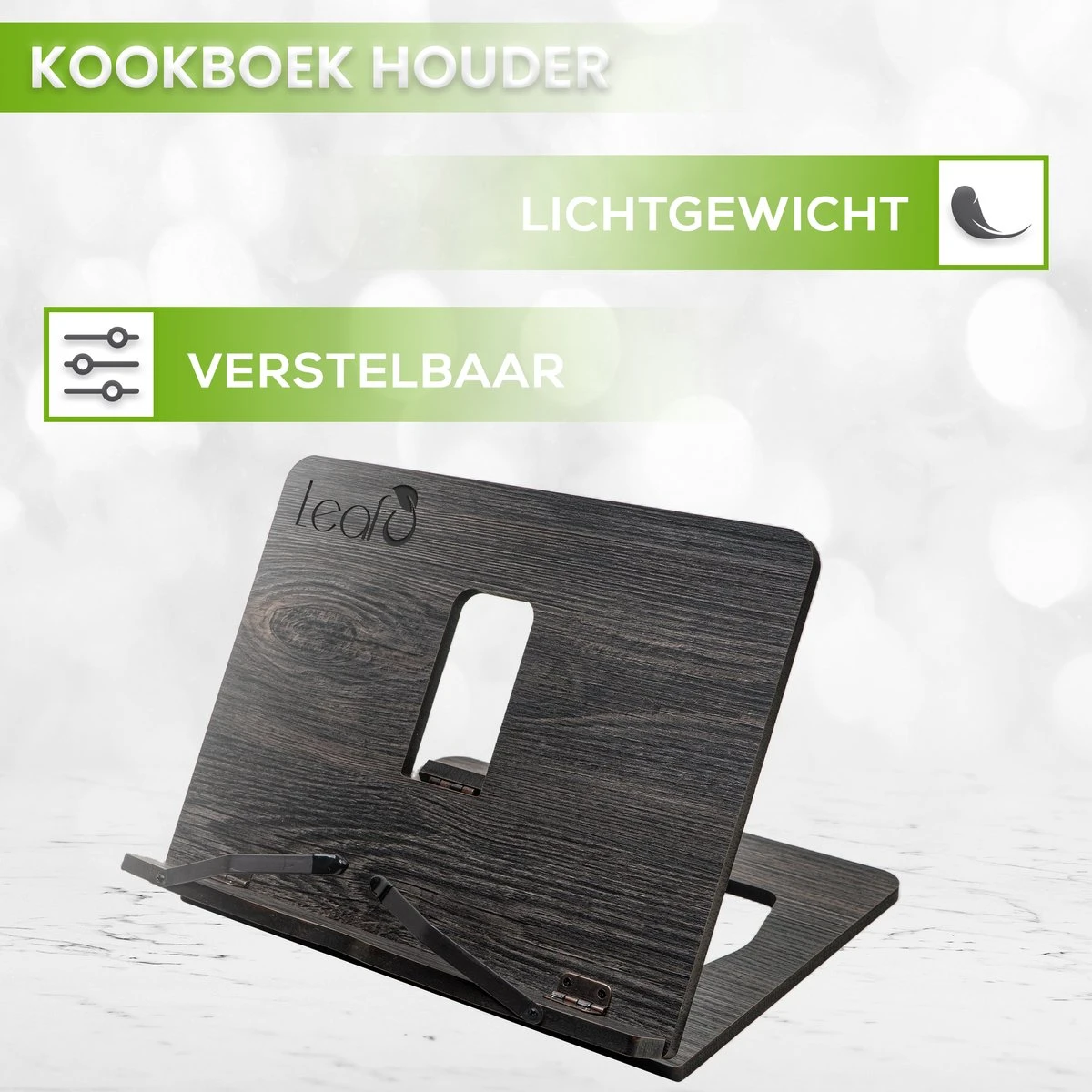 De Kookboekhouder is gemaakt van hoogwaardig MDF hout. Dit hout is erg stevig en daarnaast ook erg duurzaam, waardoor de houder erg lang mee gaat. Het hout is voorzien van een beschermende laag en is volledig splintervrij afgewerkt.