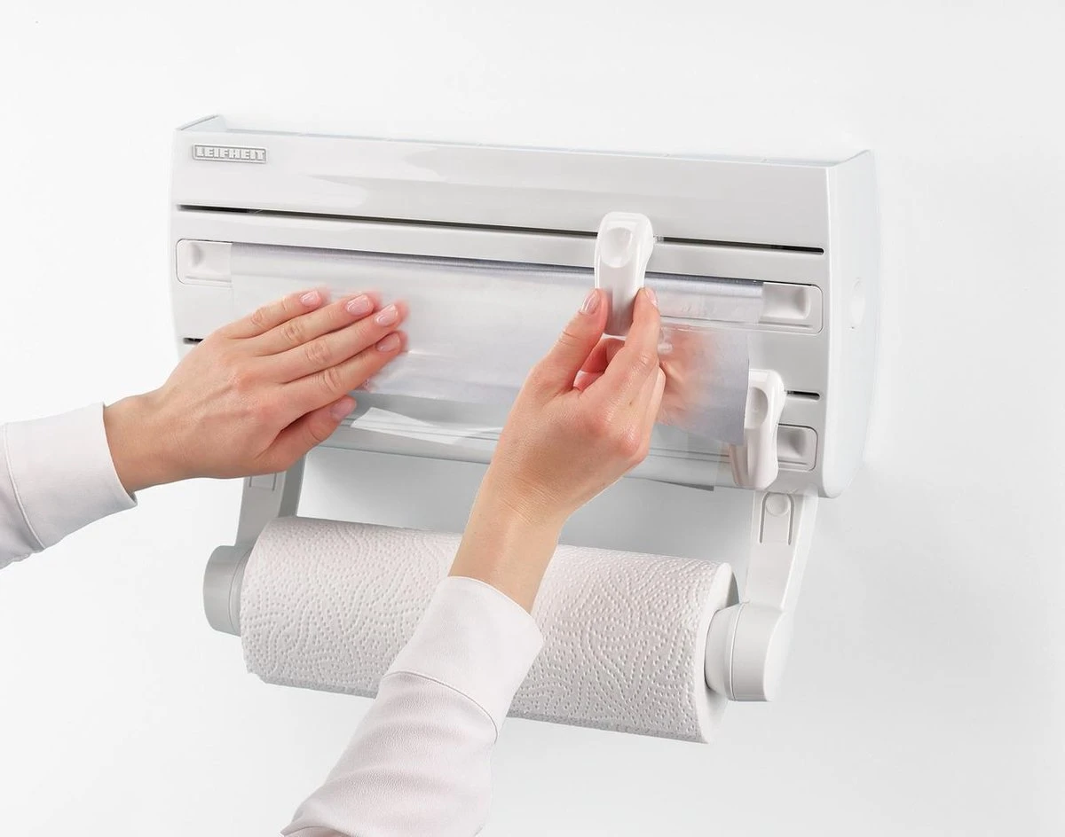 Fijn toch, wanneer je alles bij de hand hebt? Aluminiumfolie, vershoudfolie, keukenrol, kruiden. Rollenhouder Parat F2 heeft voor alles een plekje. Je kunt er kruidenpotjes op zetten, er zijn twee gesloten vakken met aluminium- en vershoudfolie en op een derde houder hangt de keukenrol altijd onder handbereik. De keukenrolhouder is afneembaar en heeft een geïntegreerde rem. Zo kun je het keukenpapier met één hand vel voor vel afscheuren. Even handig zijn de vlijmscherpe messen, die aluminium- en vershoudfolie hygiënisch en exact afsnijden. Geen lelijk afgescheurde folieranden meer en geen gepruts meer met het begin dat niet te vinden is. De folie-einden steken na iedere keer afsnijden ver genoeg uit de rolhouder – altijd gebruiksklaar en gemakkelijk vast te pakken. De messen zijn veilig achter de ergonomisch gevormde snijschuivers weggewerkt. De rollenhouder is eenvoudig aan de wand te bevestigen en snel en gemakkelijk vanaf de voorkant te vullen. Geschikt voor alle gangbare afmetingen keukenpapier. Handig: op de plek van een oude hang je zó een nieuwe op want de boorgaten komen bij alle Leifheit Parat modellen op dezelfde plek. Met pluggen en schroeven.
