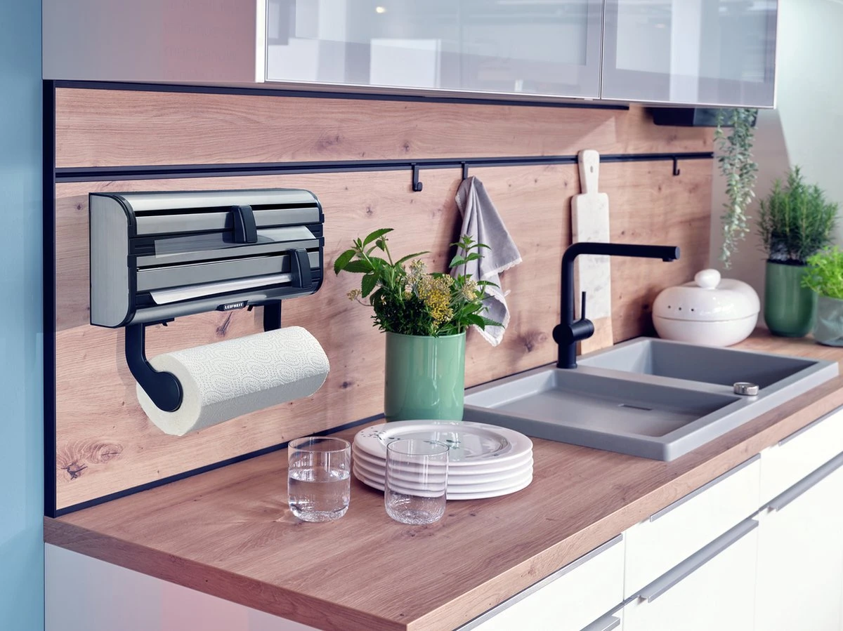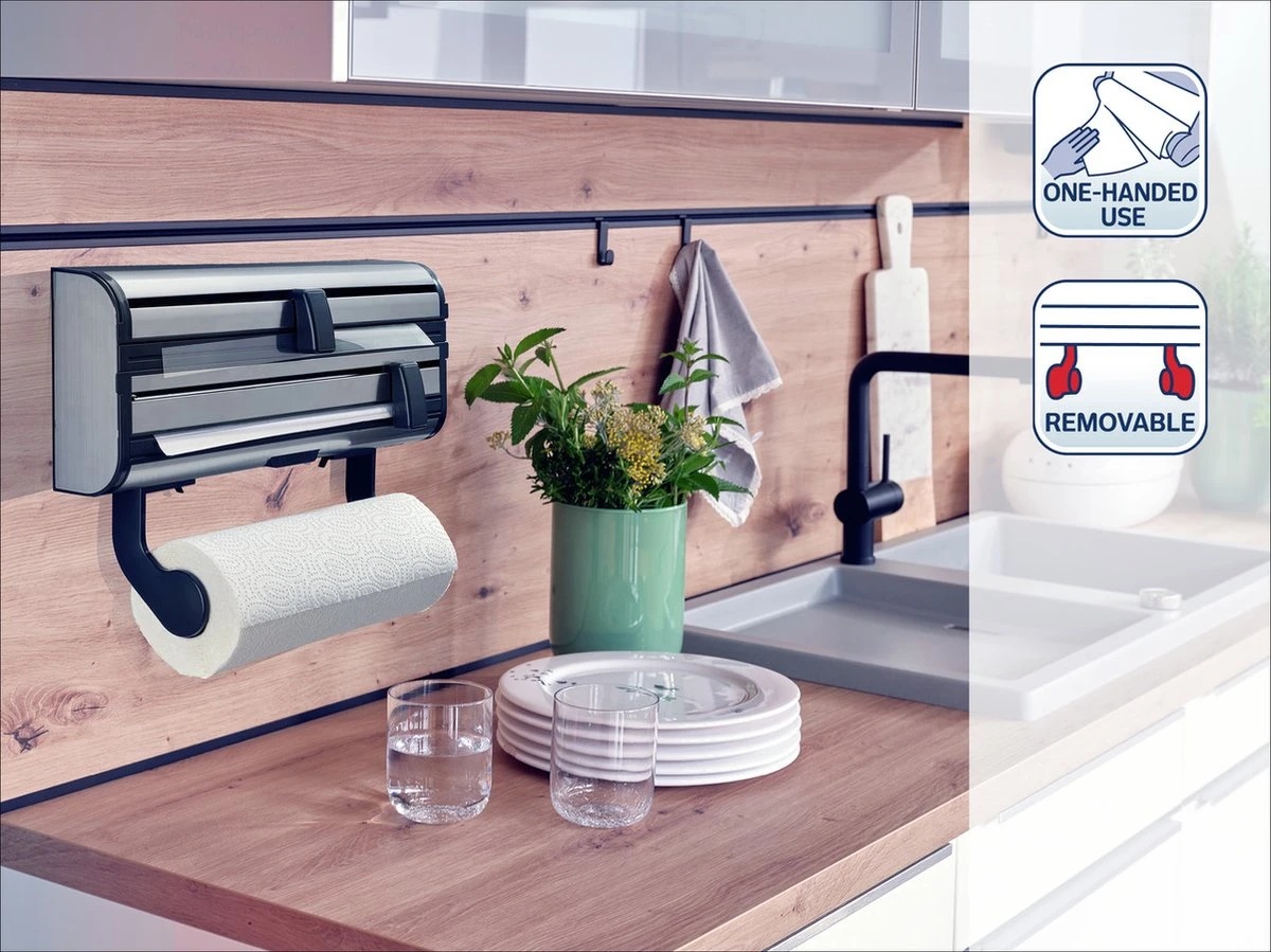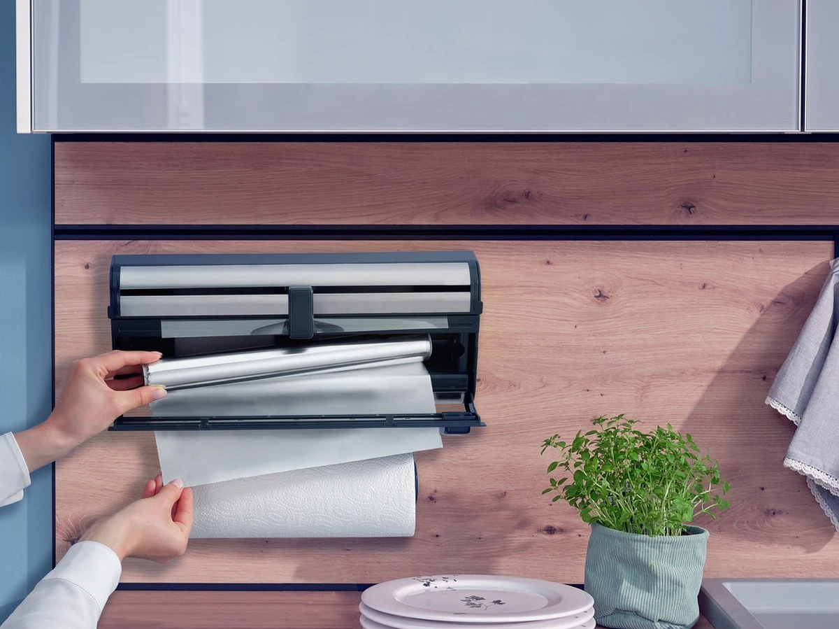 Bijzonder praktisch bij deze rollenhouder zijn de aparte vakken voor aluminiumfolie en vershoudfolie. Een nieuwe rol folie inzetten is supergemakkelijk. Gewoon de klep openen, rol erin, klep sluiten – klaar. Dankzij de vlijmscherpe mesjes wordt de folie strak afgesneden: even schuiven met het lichtlopende schuifmesje. Ook de keukenrol past in deze rollenhouder voor de keuken. Gemakkelijk af te scheuren met één hand, dankzij de afremfunctie. Bovendien kun je de keukenrolhouder ook loshalen.