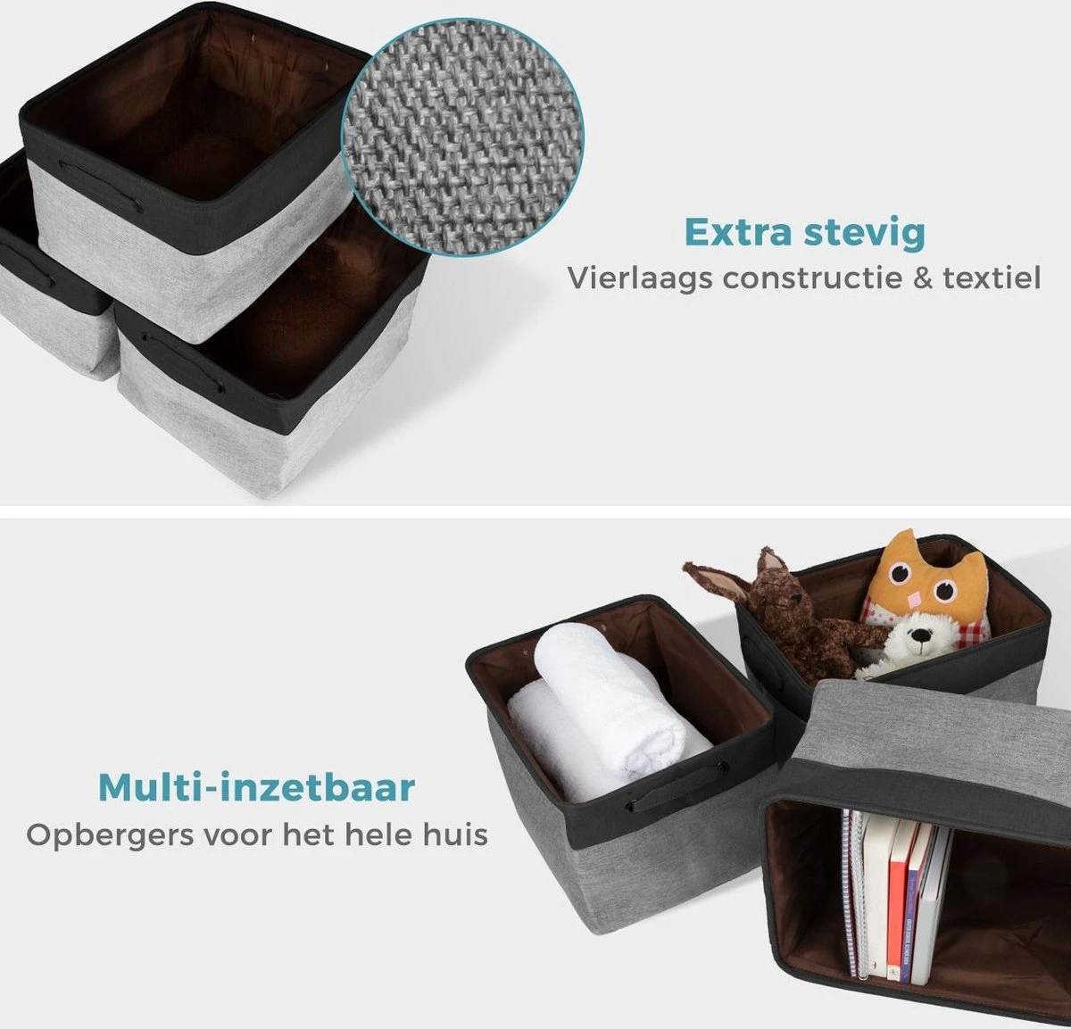 De organizers zijn zeer stevig en gemaakt van vierlaags vlies karton en afgewerkt met hoogwaardig textiel. De organizers zijn opvouwbaar, wat super fijn is mocht je ze even niet nodig hebben. Tot slot zijn de organizers waterafstotend, te gebruiken in vochtige ruimtes en makkelijk af te nemen met een vochtige doek.