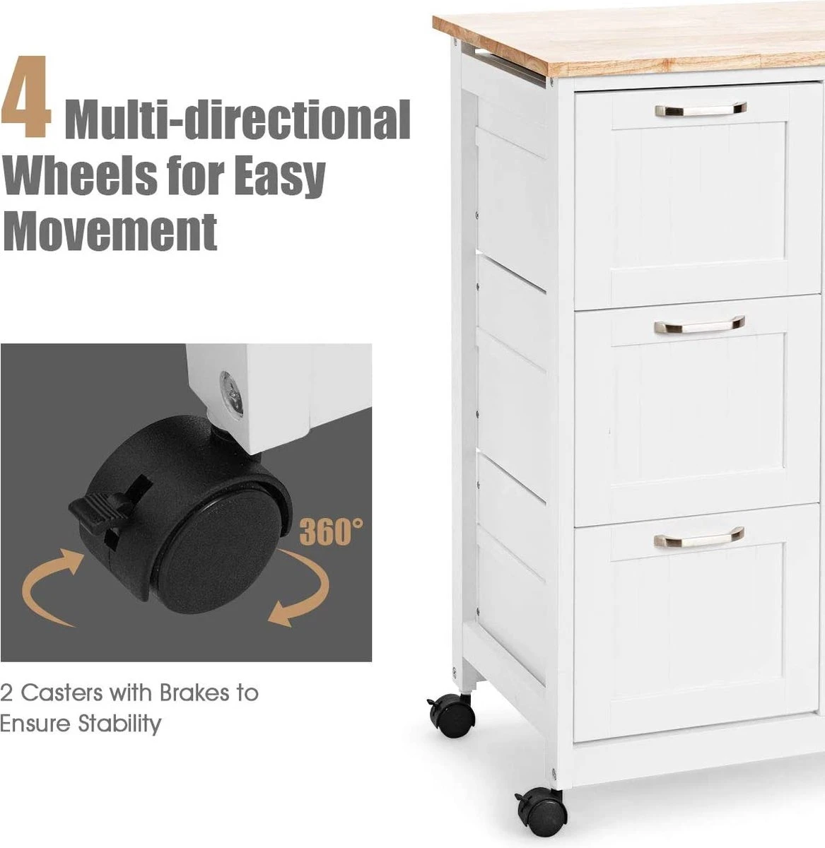 - 【360° zwenkwielen voor vrije mobiliteit】Uitgerust met 4 universele wielen, kan de keukeneiland kar gemakkelijk worden geduwd naar waar u maar wilt. Bovendien, 2 van hen zijn vergrendelbaar met remmen, zodat u de kar in positie kunt houden, zorgen voor grote veiligheid en gemak.