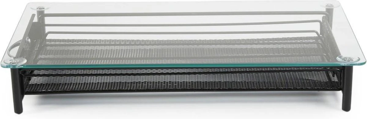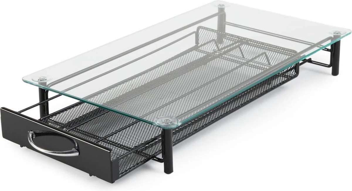 De lade is afgedekt met een glazen plaat waar je je koffieapparaat of glazen op kwijt kan. Zo heb je alles dicht bij elkaar! Verder geeft de houder door het gebruik van glas en metaal een minimalistische en strakke uitstraling wat je overal kwijt kan.