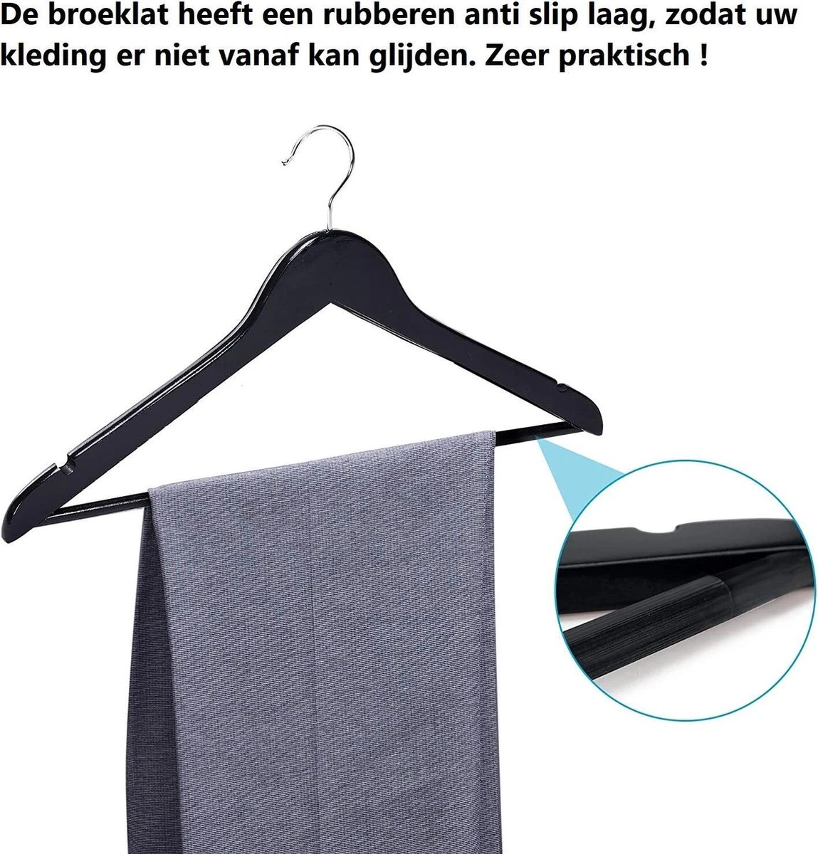 De houten kledinghangers van zijn voorzien van een broeklat met anti slip laag om eenvoudig en mooi broeken op te hangen, zonder dat ze eraf glijden. Dit is niet alleen praktisch maar het vermindert ook de vouwlinnen de broek die ontstaan bij het opplooien van een broek wanneer u die in de kast legt.