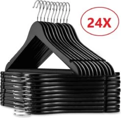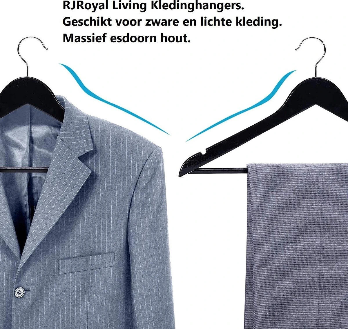 Een prachtige opgeruimde kast met de kledinghangers Zwart “Jannigje Style” van sterk esdoorn hout van RJRoyal Living. Met deze top kwaliteit kledinghangers van massief hout kunt u eenvoudig alle kledingstukken ophangen. De zwarte kleerhangers hebben een zeer fijne afwerking en zijn multifunctioneel omdat ze uitgerust zijn met inkepingen, broeklat en een 360° draaibare haak.