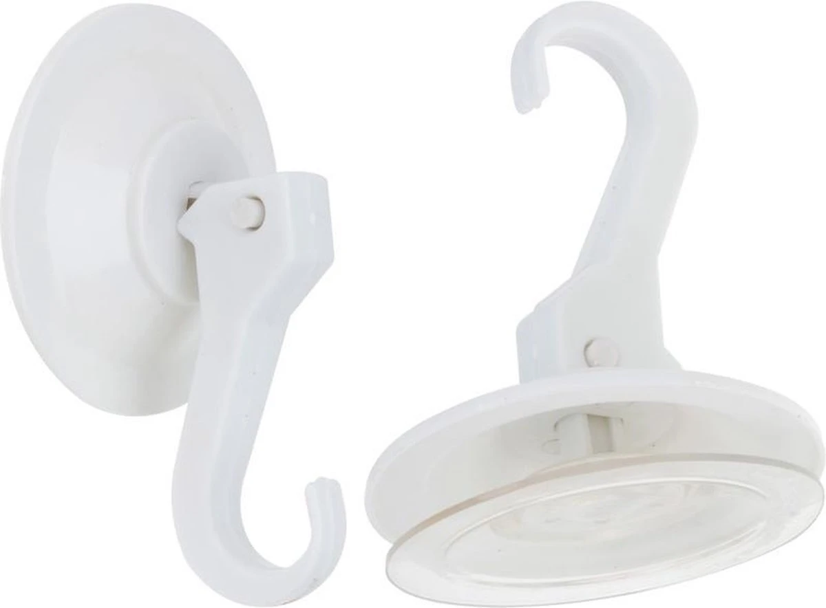 Een blistercard met 4x ophang haken met zuignappen voor in de badkamer of keuken. De zuignap kan strak gezet worden op een gladde en schone ondergrond, door de haak als hevel te gebruiken. Blijft op alle gladde ondergronden haken. Max. draaggewicht: 2 kg. Afmeting zuignap: ca. D 7,5 cm. Hoogte wanneer haak naar beneden: ca. 10,5 cm.