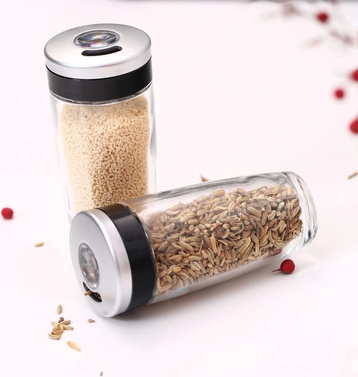 Glazen kruiden / specerijenpotjes voorzien van strooi deksel.