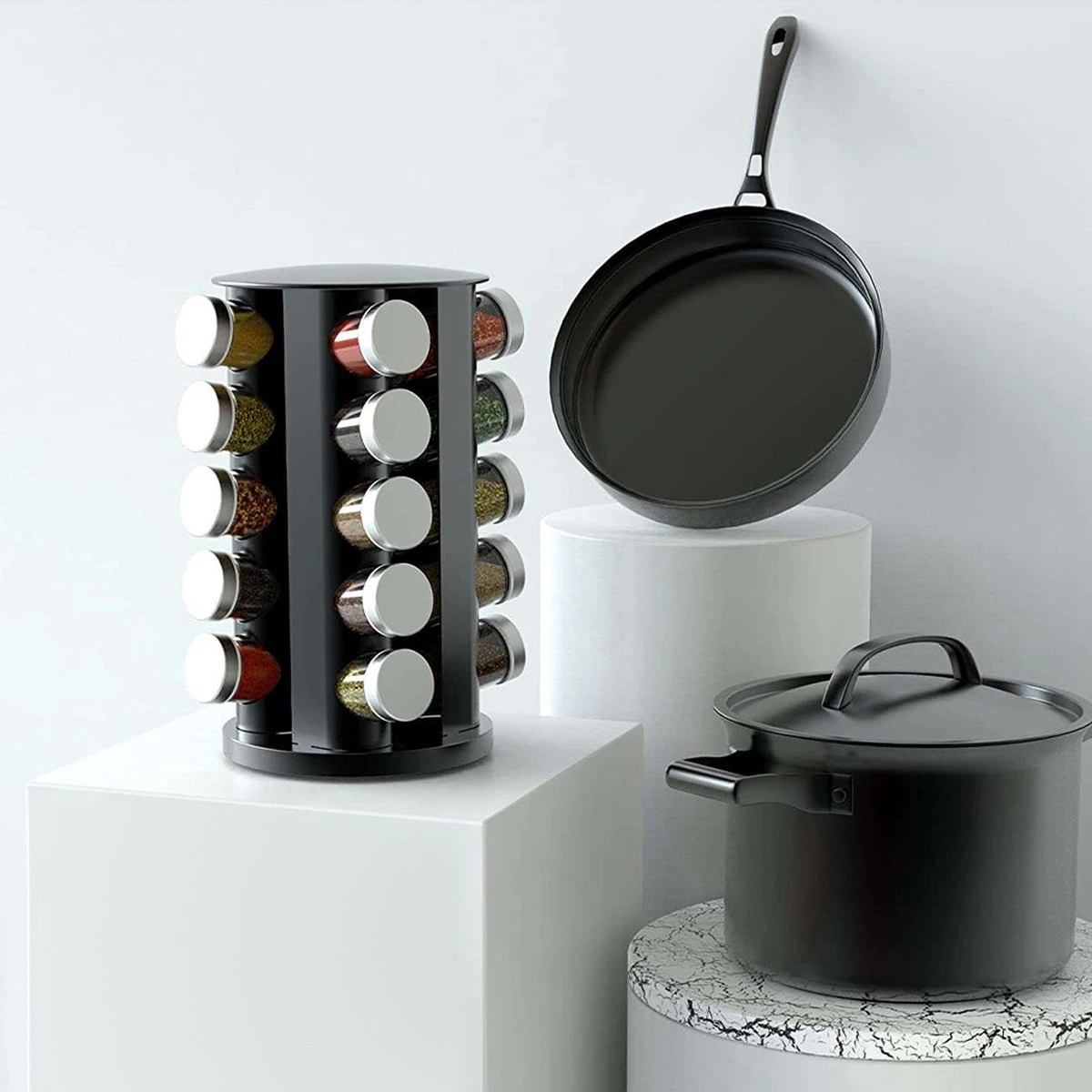 Het kruidenrek is 360° draaibaar, geluidloos en de potjes blijven stevig in de houder zitten.