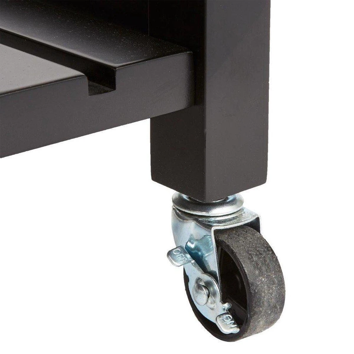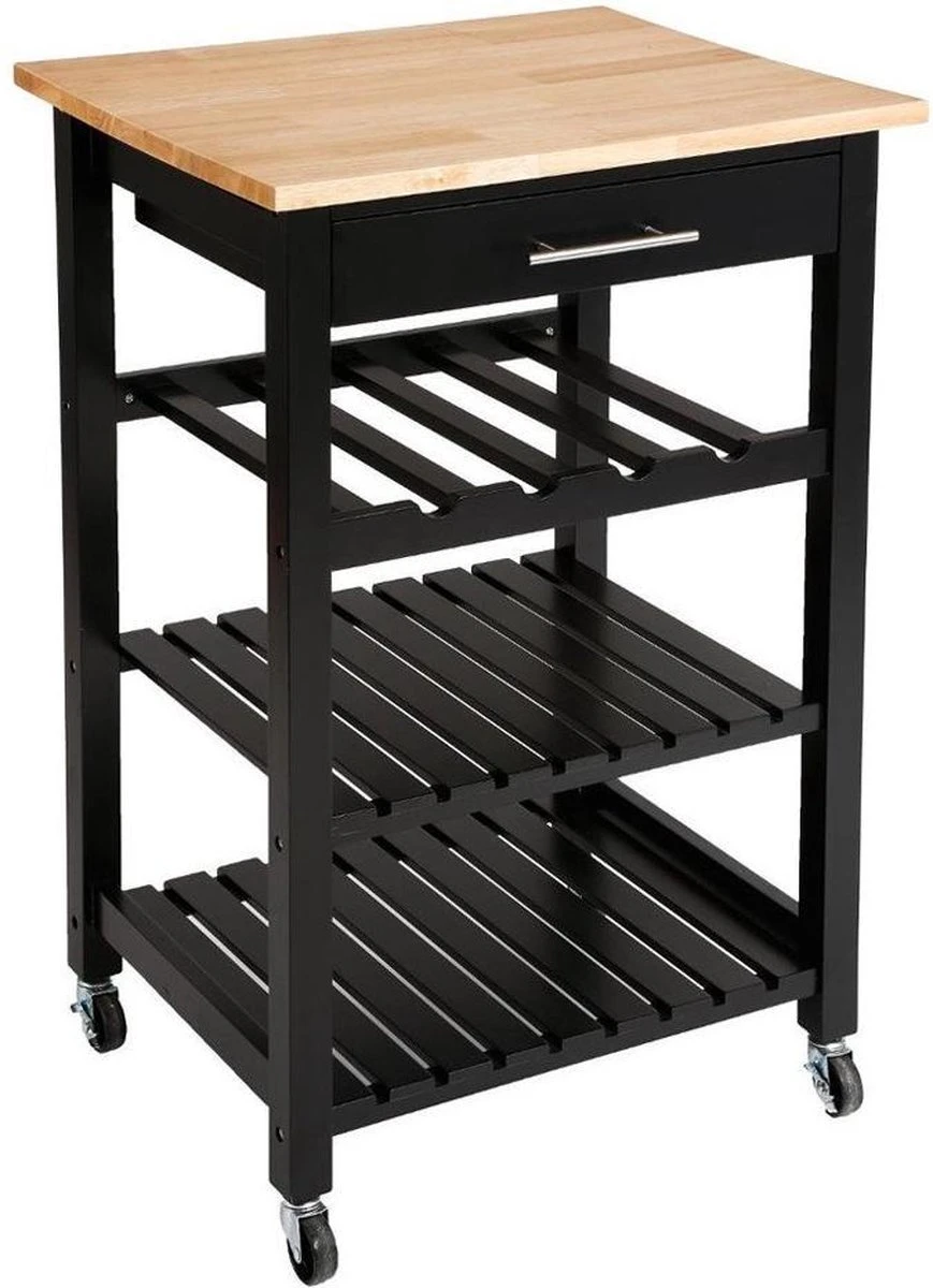 Deze compacte zwarte keukentrolley van Eazy Living heeft 4 PVC zwenkwielen, 3 leggers en 1 lade met handvat. Op het houten werkblad kan je voorbereidingen doen. Perfect voor kleine keukens en bijkeukens. Het frame is gemaakt van MDF en het werkblad is van hout. Afmetingen 58 cm x 48 cm x 87,5 cm.