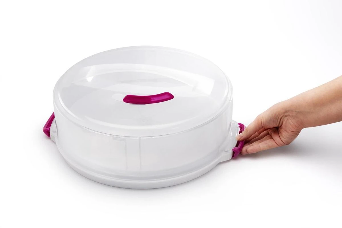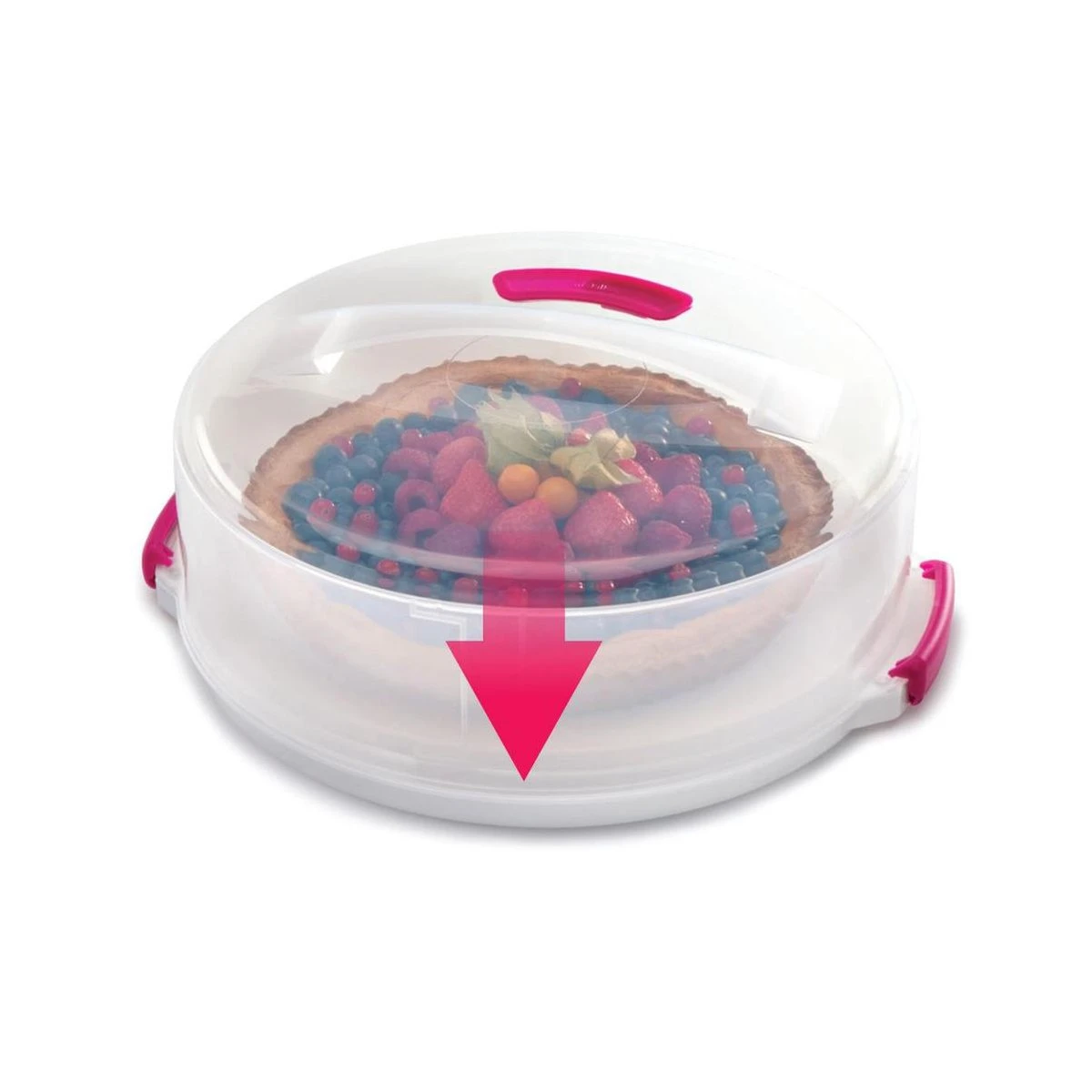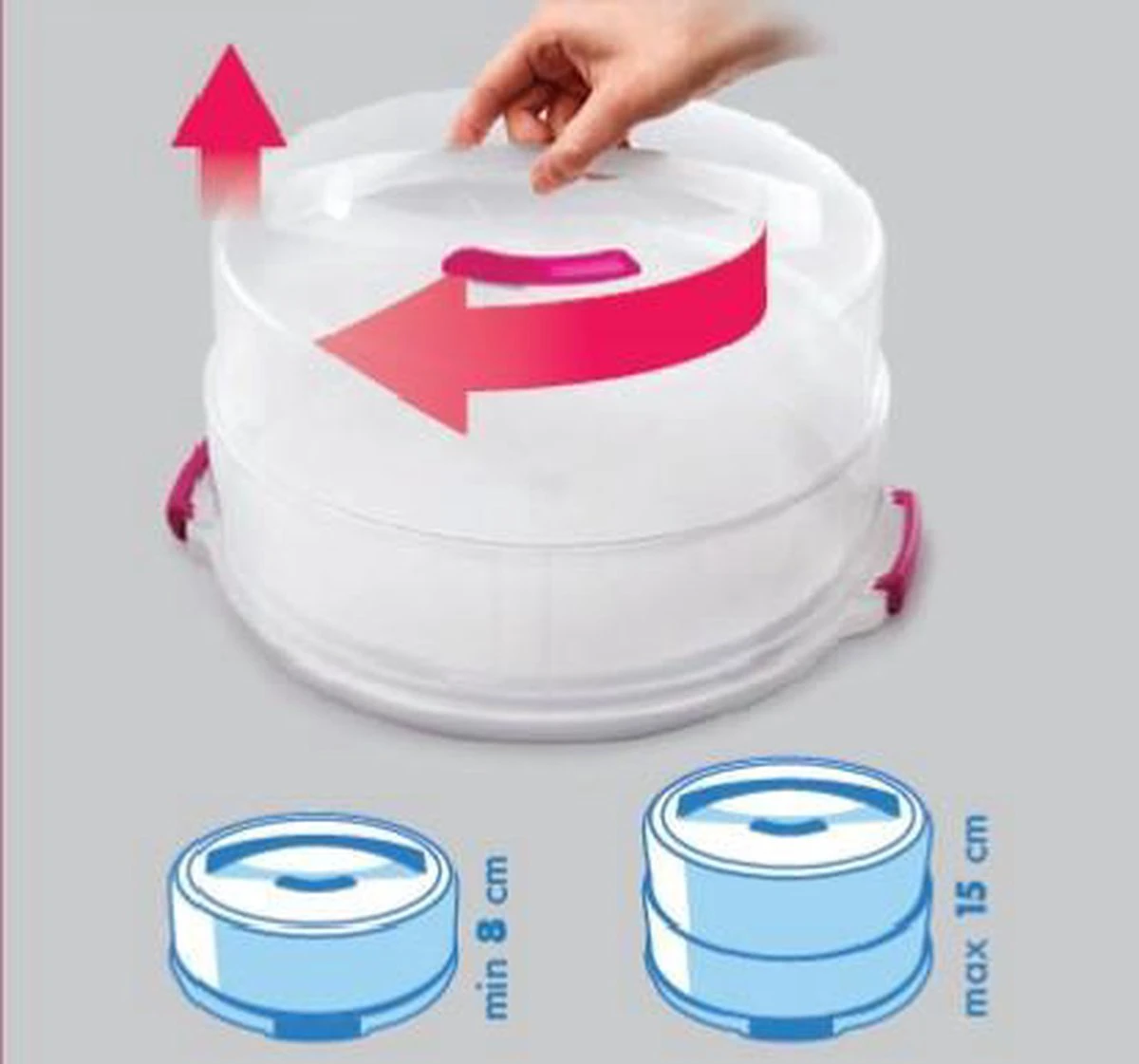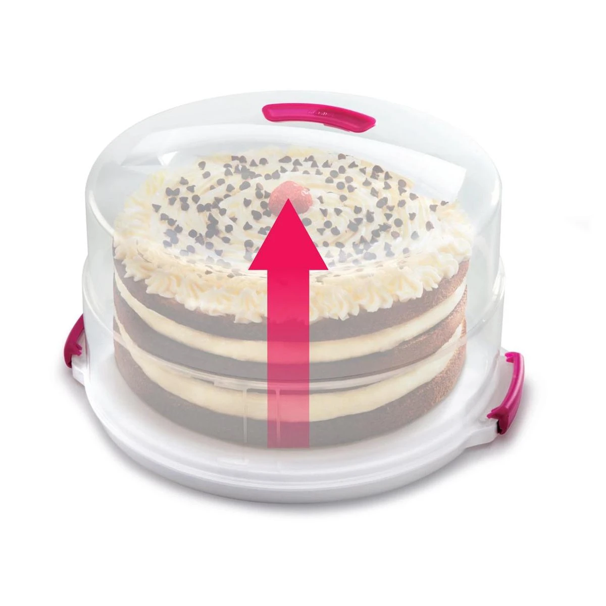 Metaltex Dolceforno Verstelbare vershouddoos voor taarten. De transparante taartdoos heeft een hoogte van 80mm en is verstelbaar tot een hoogte van 150mm. De diameter van de taartdoos is 36cm.