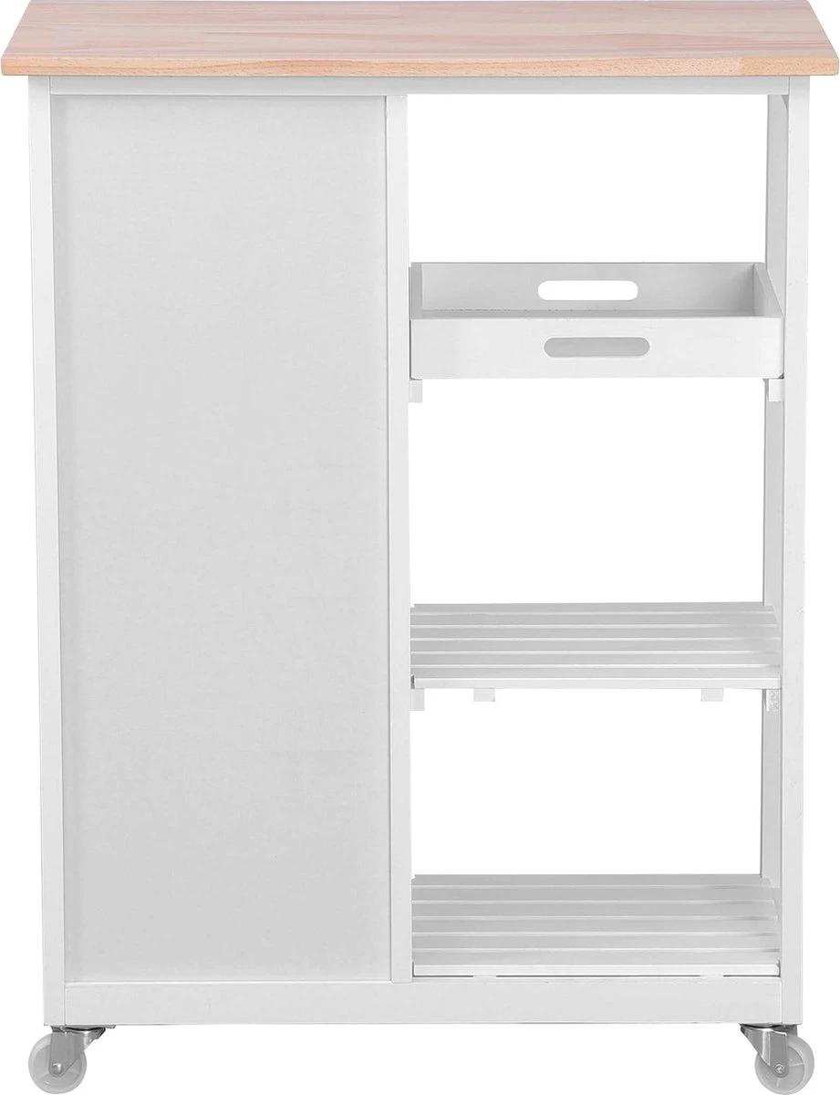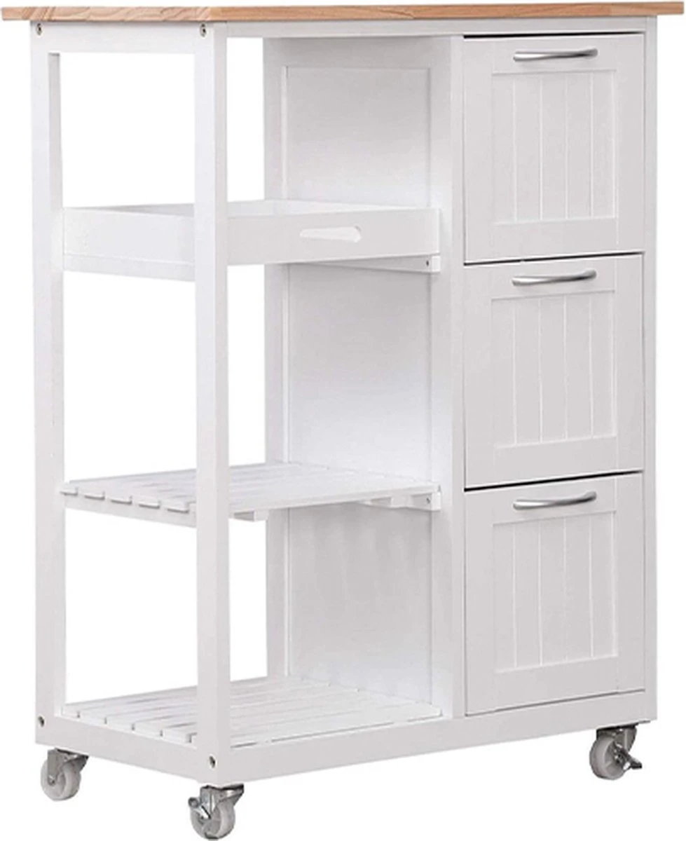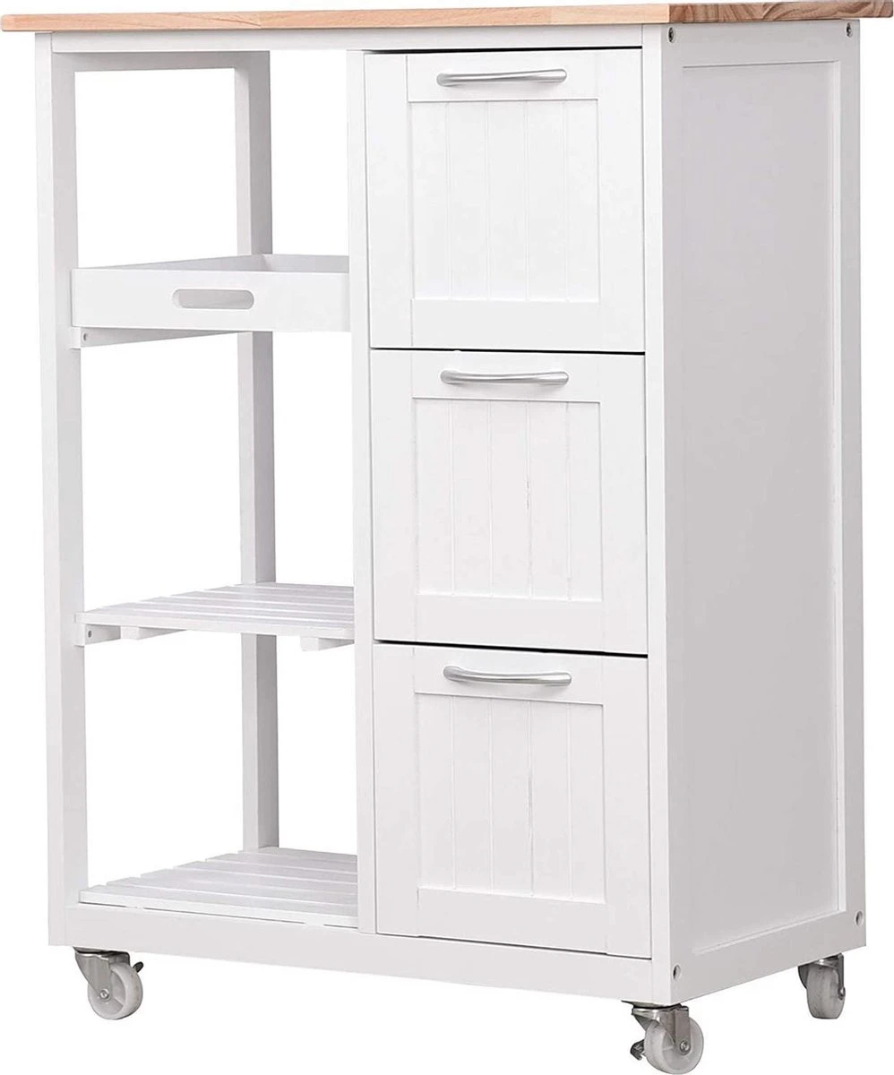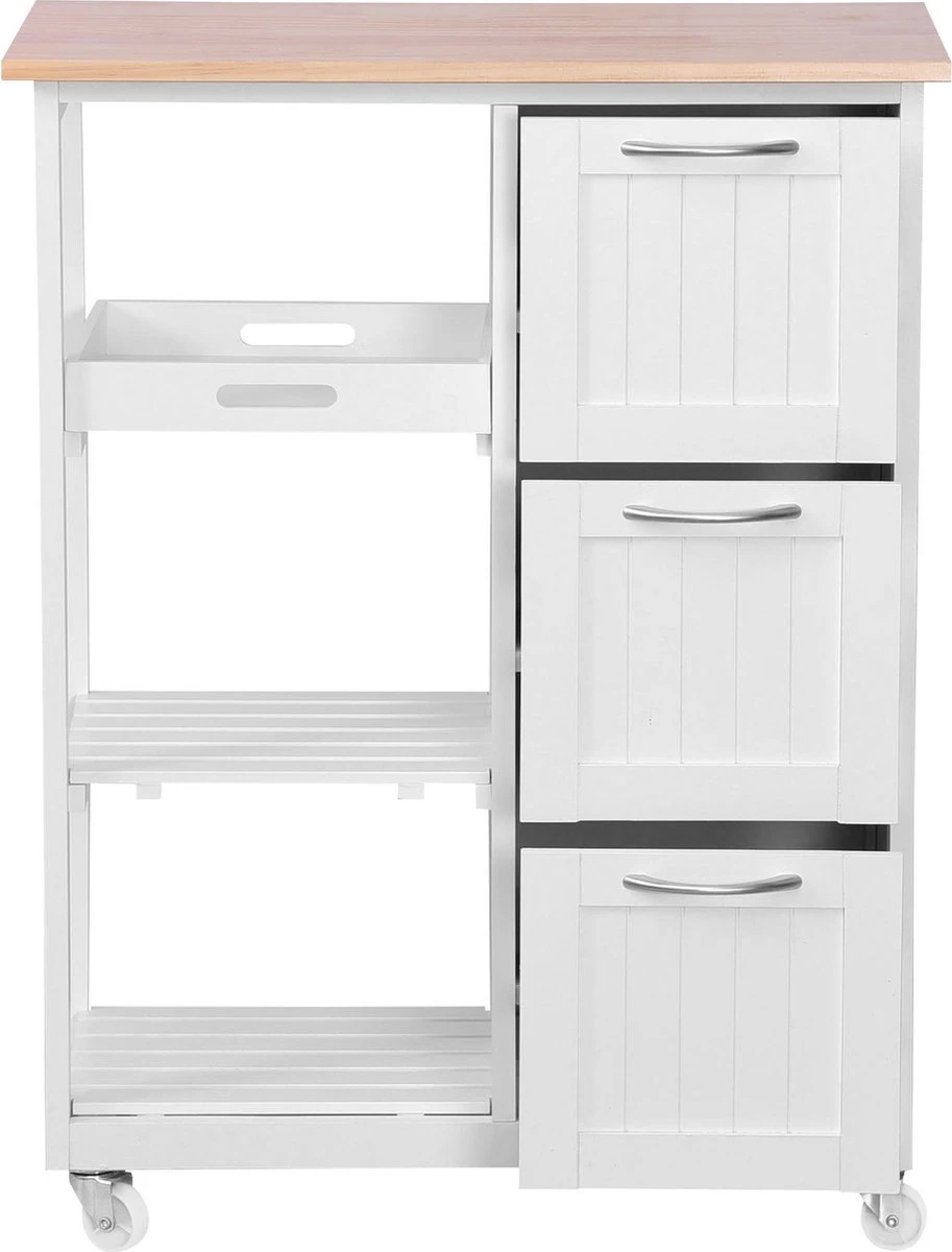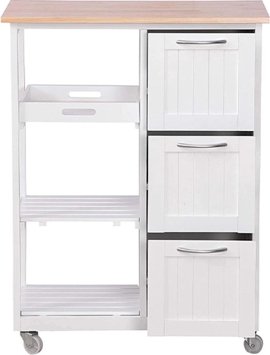 Keuken trolley op wieltjes – 3 lades en 3 plankjes – Wit Altijd al een keukentrolley in de keuken willen hebben? Dan hebben wij nu een superleuke aanbieding voor jou! De keukentrolley is gemaakt van hoogwaardig materiaal en handig in gebruik. Door zijn compacte formaat en moderne uitstraling past hij in iedere keuken. Door de zwenkwielen is deze trolley praktisch in gebruik. Zet hem op een vaste plek in de keuken of rol hem door jouw appartement of woonkamer. De trolley is onder andere geschikt om jouw (kook)boeken of keukenaccessoires goed te organiseren en bij de hand te hebben. Gebruik de trolley in de keuken of zomers bij het bbq’en. Uiteraard dient hij ’s avonds wel weer binnen te worden gezet. Deze keukentrolley beschikt over diverse planken en lades en heeft hierdoor een ruime opslagcapaciteit. * Keuken trolley op wieltjes, 3 lades en 3 plankjes, in wit, country house stijl. * Een van de niveaus dient ook als een verwijderbare serveer tray. * Afmetingen: 67 x 37 x